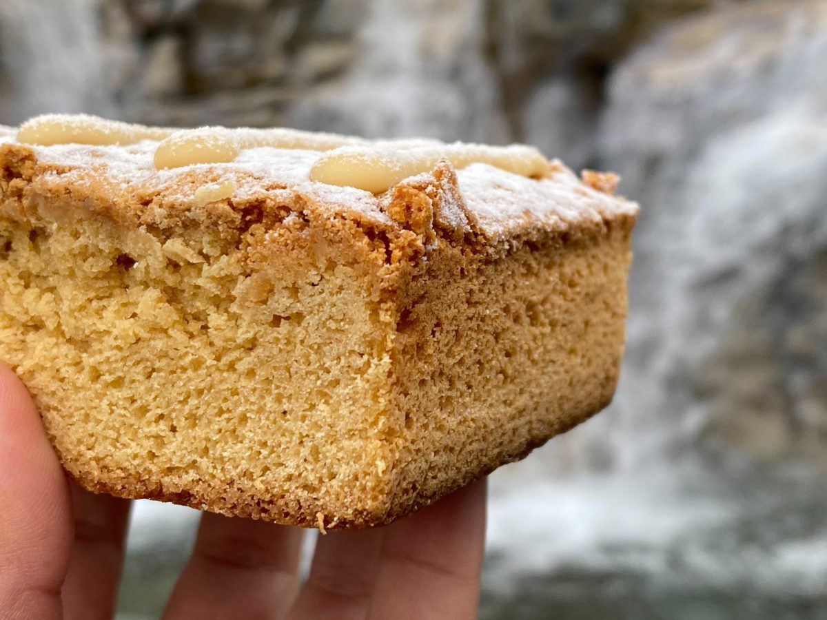 The first thing we noticed was that this was a very generous portion, both in the size of the cut and the depth of the piece. It’s your basic blondie, topped with a drizzle of sweet icing and powdered sugar.
