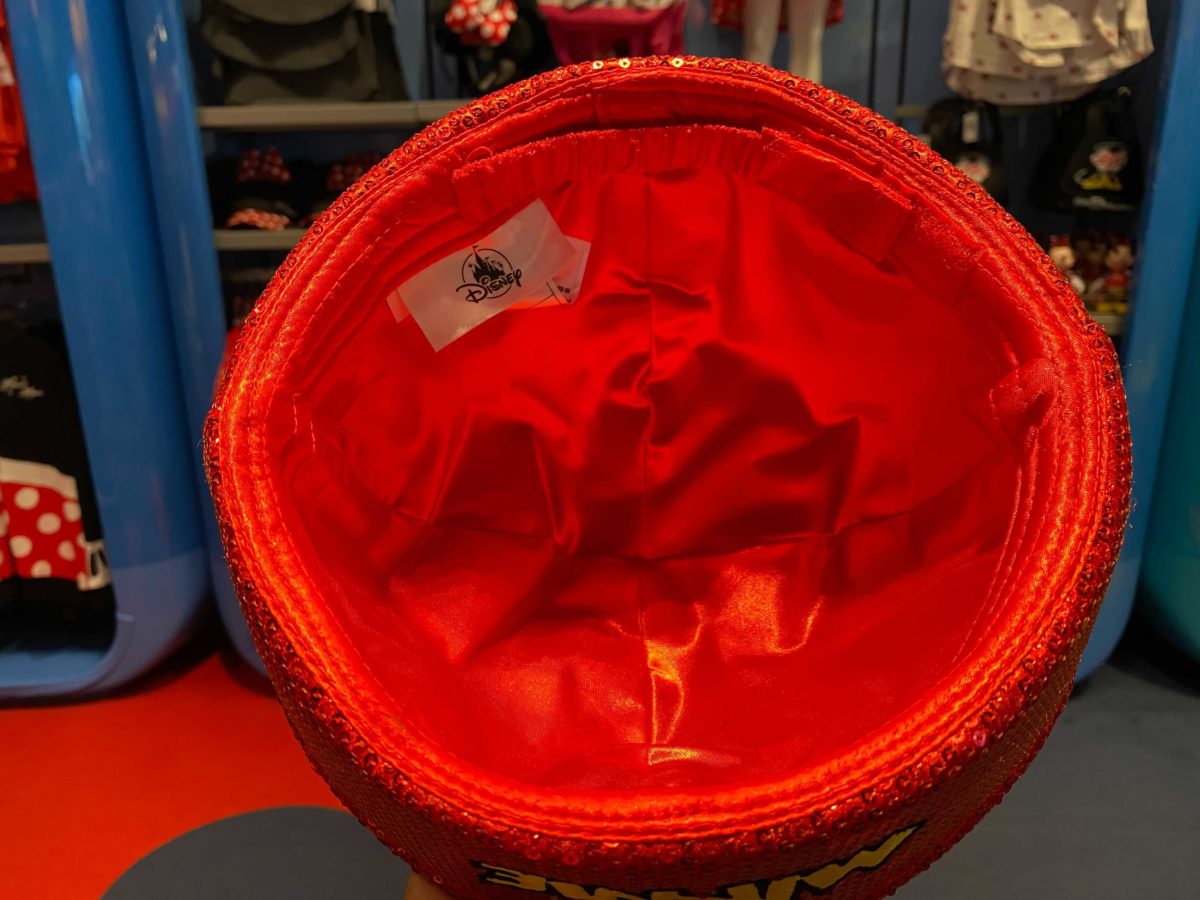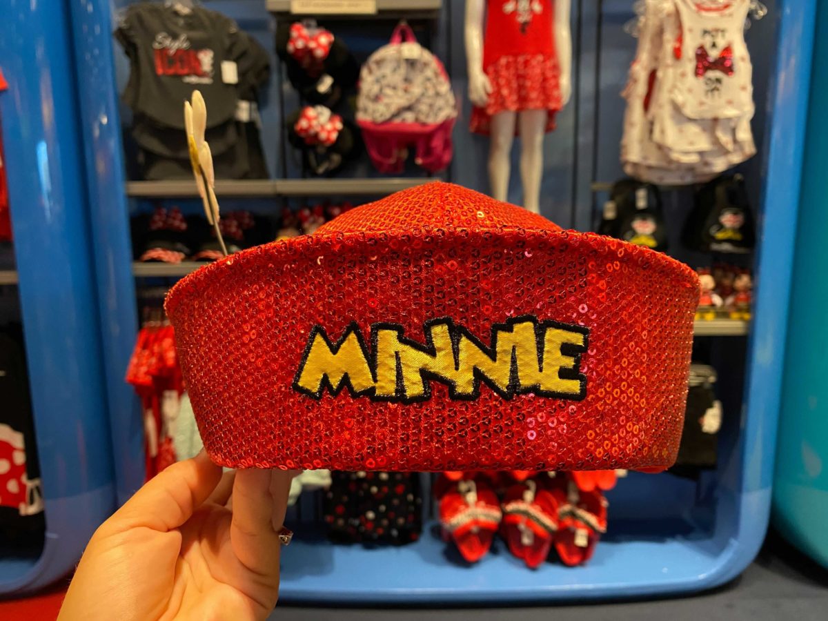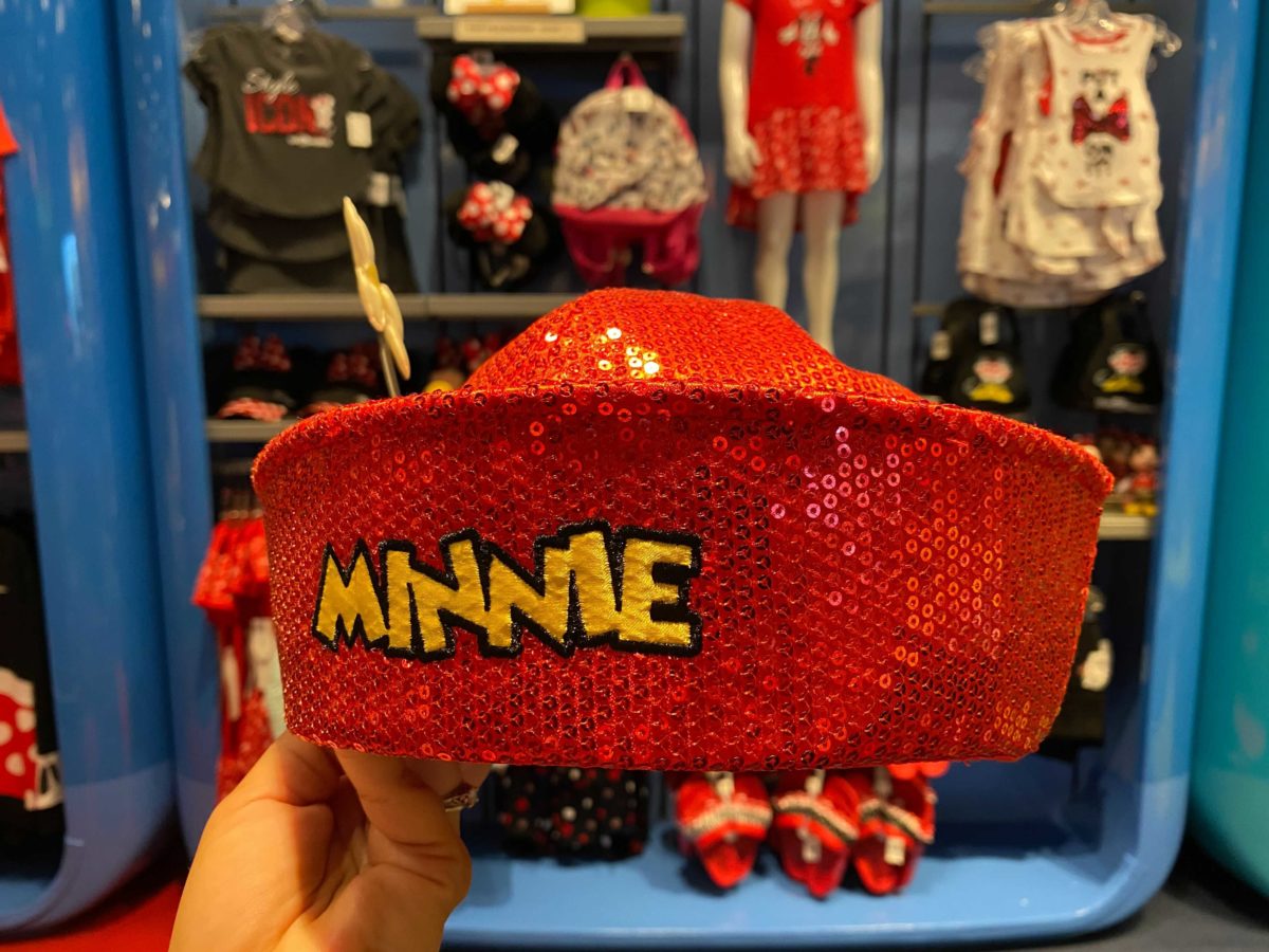 The red hat is covered in sequins, with Minnie’s name embroidered on the front in yellow.