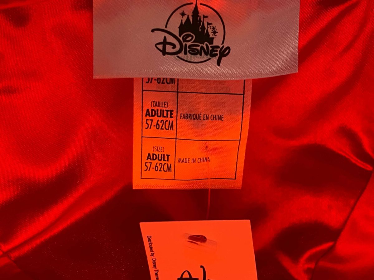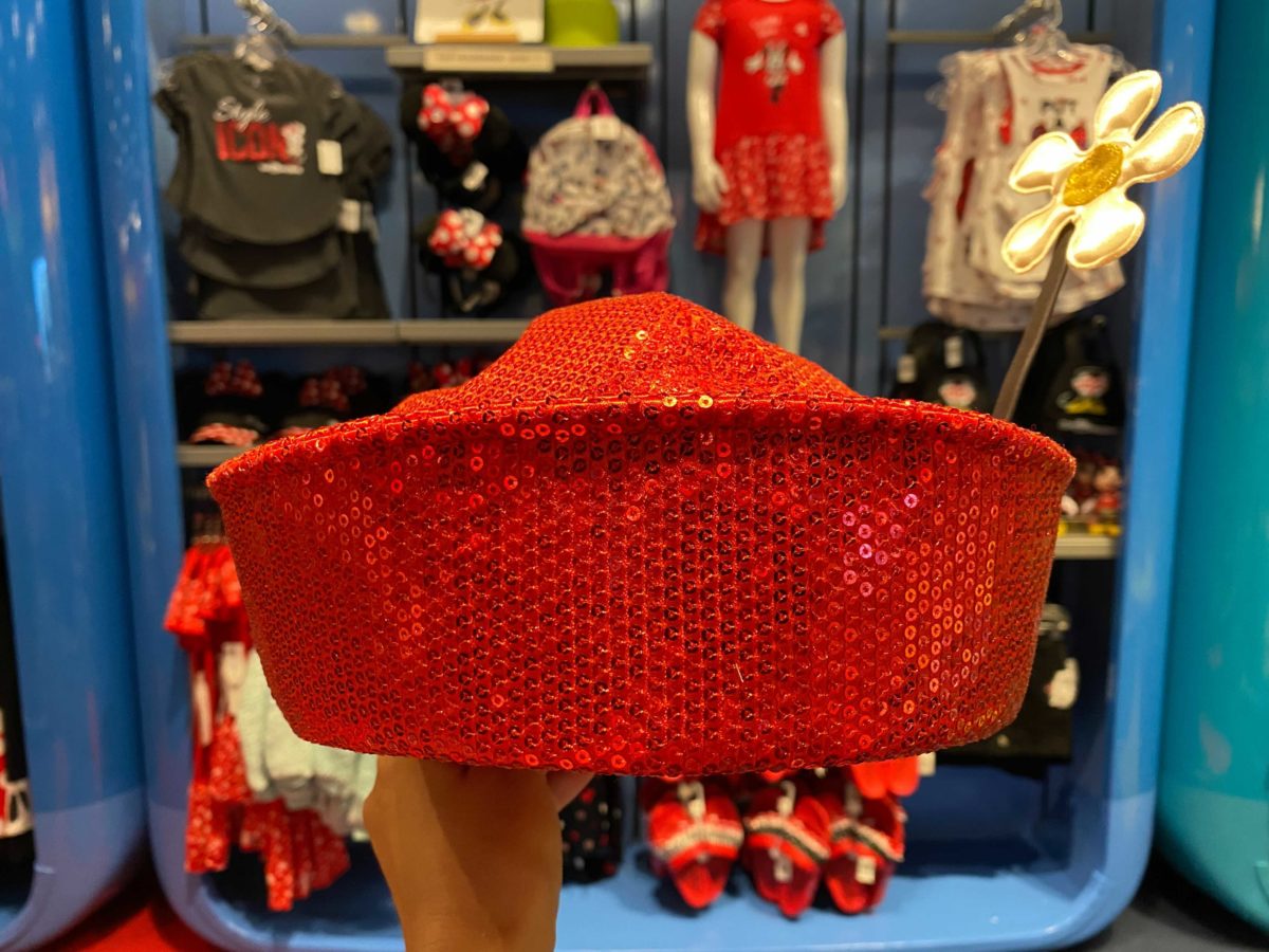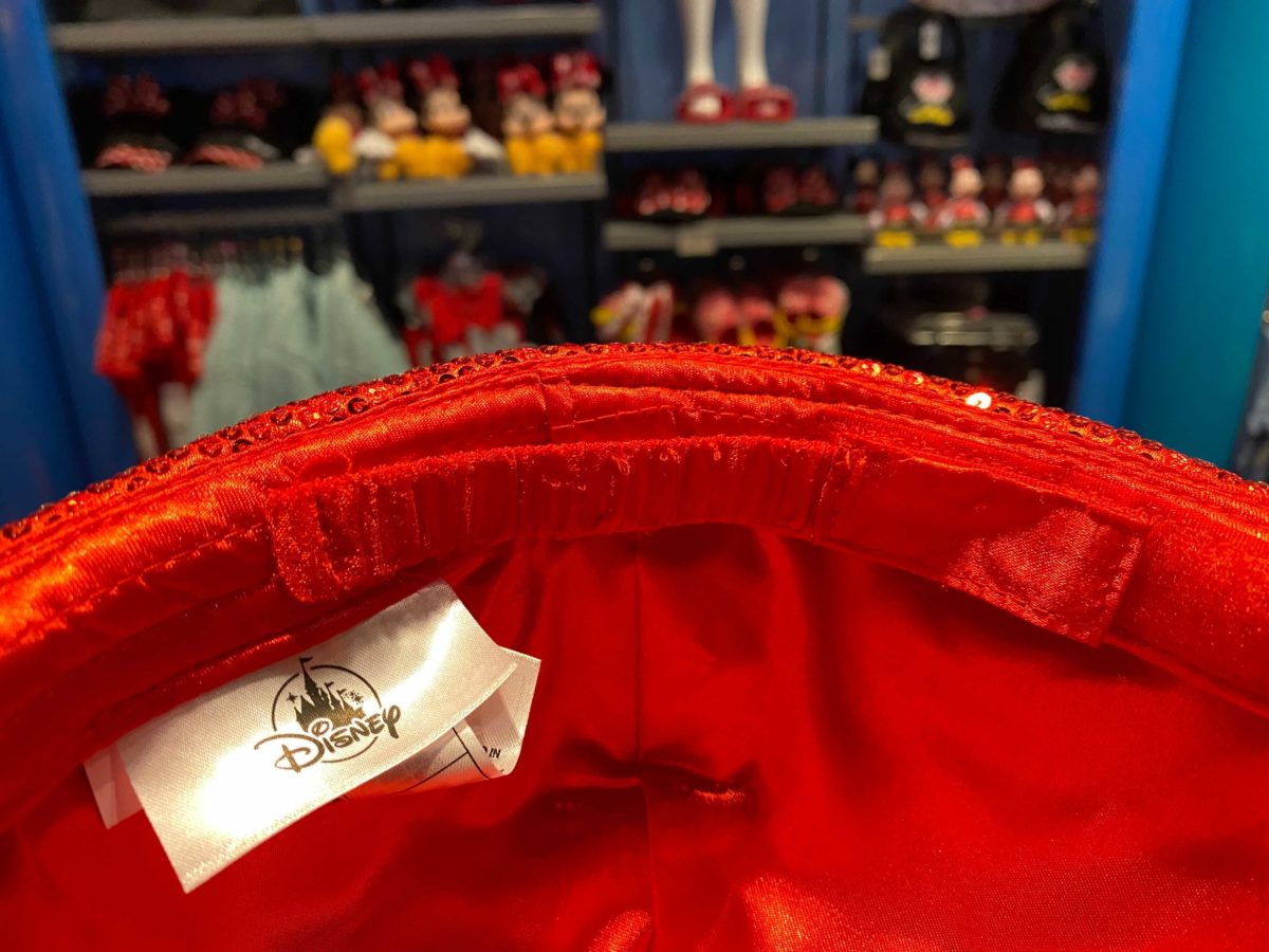 The red hat is covered in sequins, with Minnie’s name embroidered on the front in yellow.