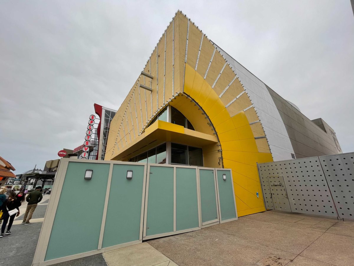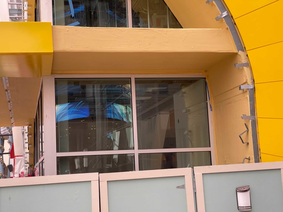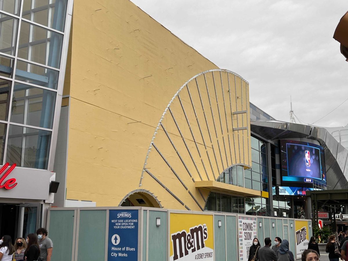 The exterior of the upcoming Disney Springs M&M’s Store is getting a bit brighter. Construction crews have begun to cover primered walls with bright, shiny yellow panels. Most of the work is taking place near the store’s main entrance doors.