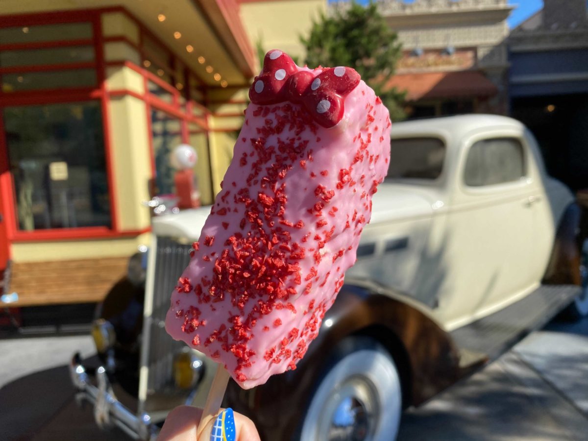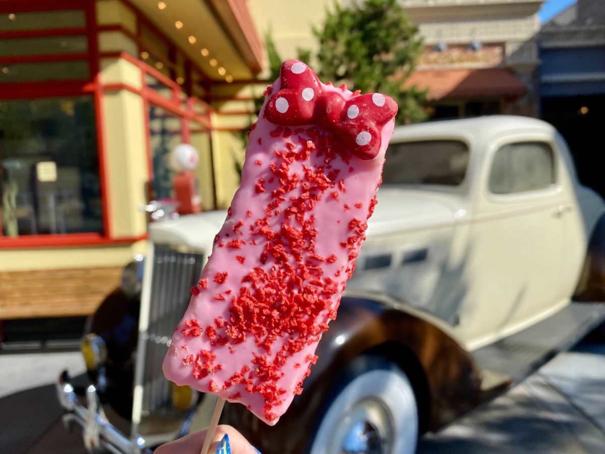 This white chocolate covered crispy treat has a candy Minnie bow on top, and is covered in freeze dried strawberry crumbs.