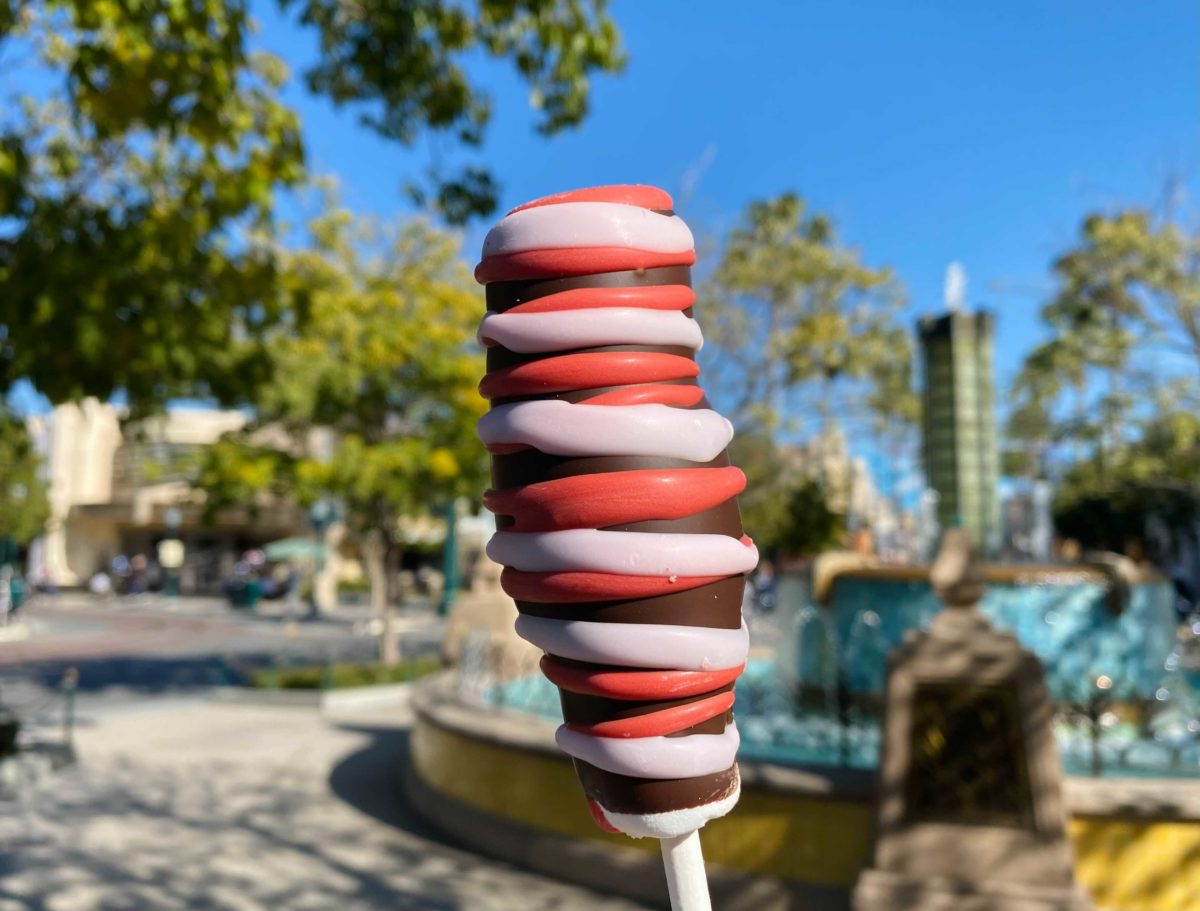 This marshmallow treat is covered in chocolate, with red and pink striped frosting on top!