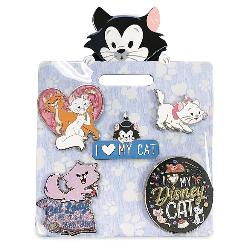 The Disney Cats pin set comes on a backing card featuring Figaro peeking over the top.