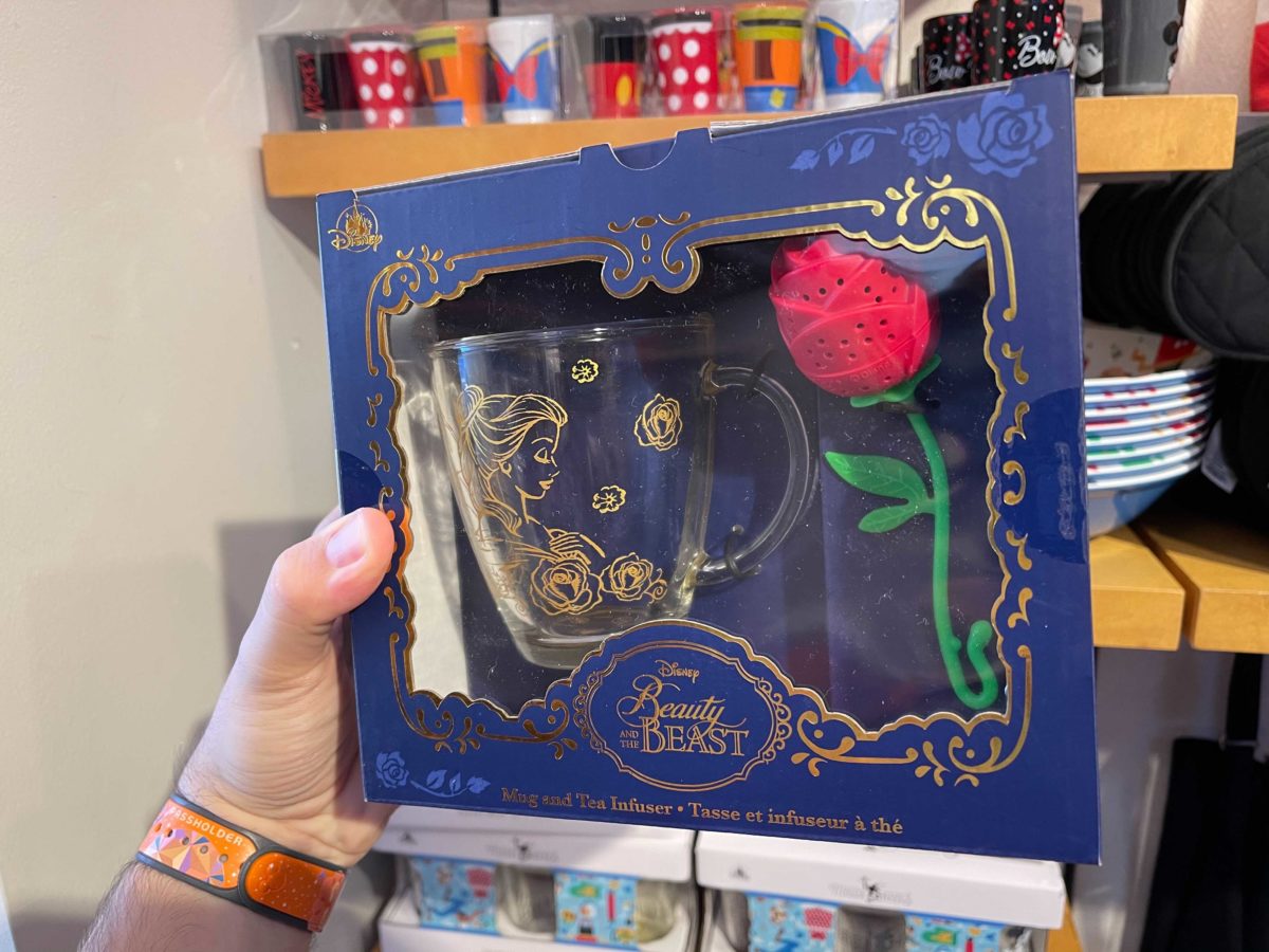 The clear glass mug features golden Belle and Beast illustrations adorned with roses and the Enchanted Rose serves as delightful infuser for your tea.