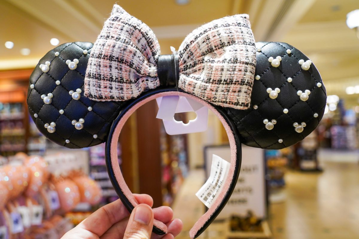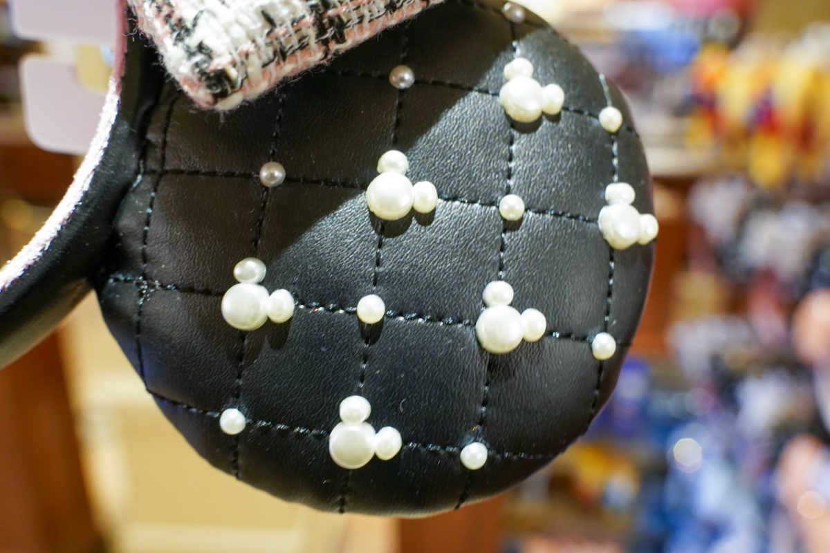 The ears and the top layer of the headband are made up of faux leather. Tiny pearls and Mickey-shaped pearls form a quilted pattern.