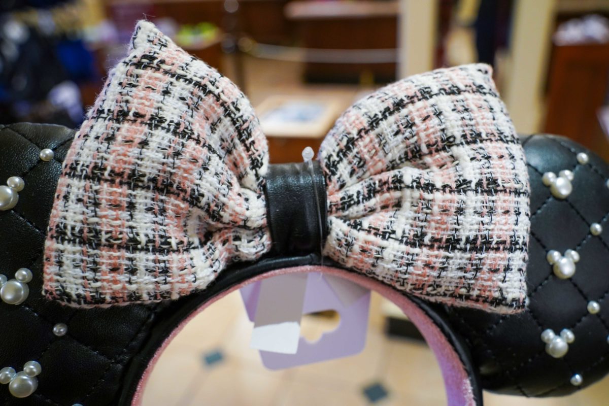This pair of ears certainly look designer – but they aren’t nearly the designer price! Featuring a tweed pink and black bow to assist in the pink and black color scheme, these Minnie ears are sure to make quite the fashion statement.