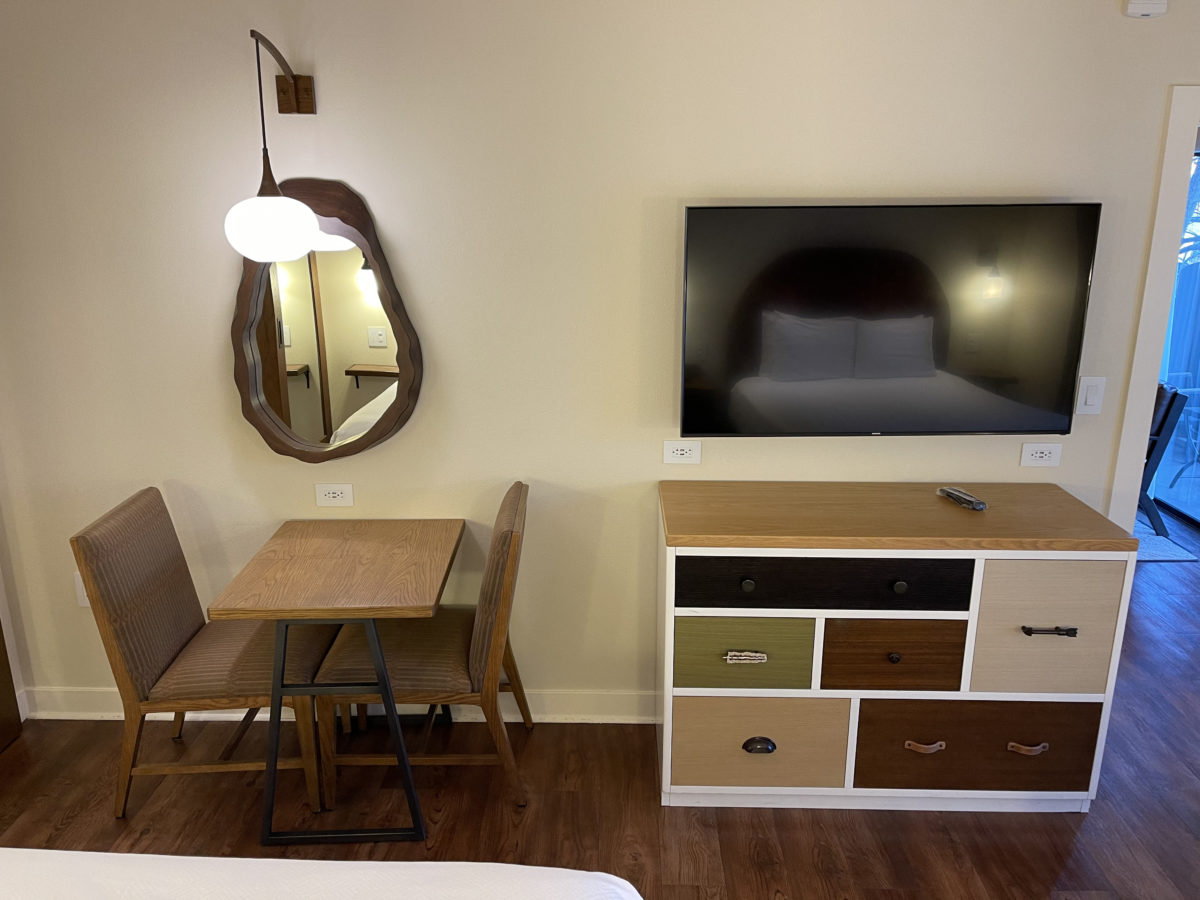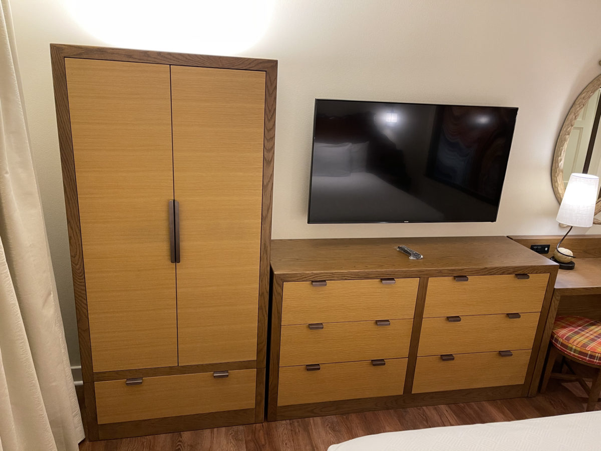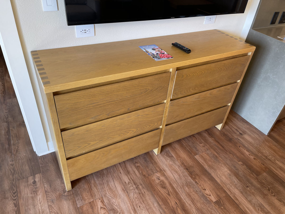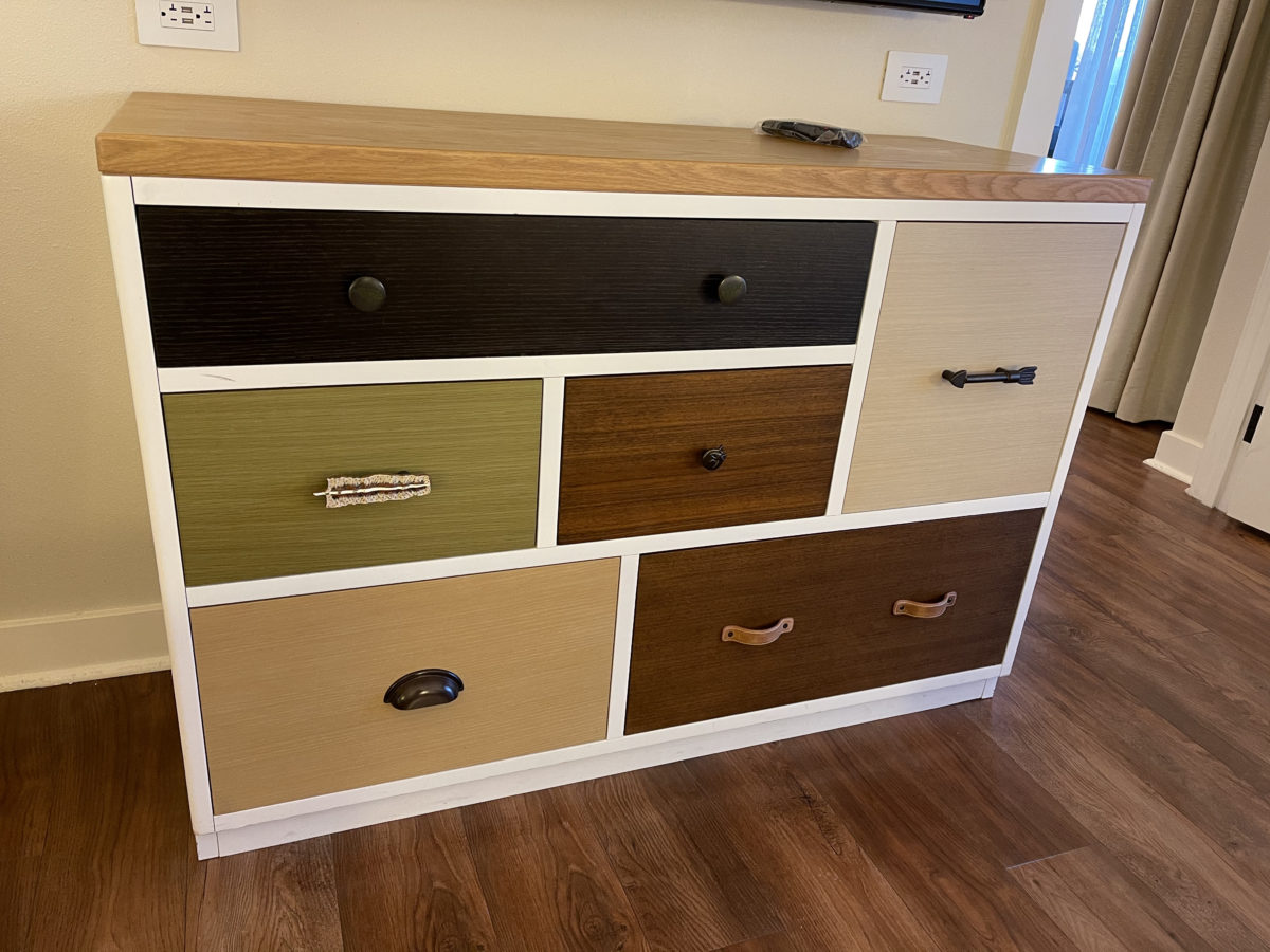 There’s a wall-mounted TV and a colorful blocky dresser.