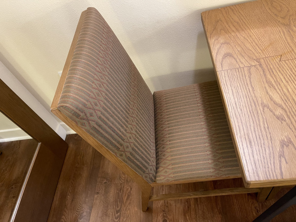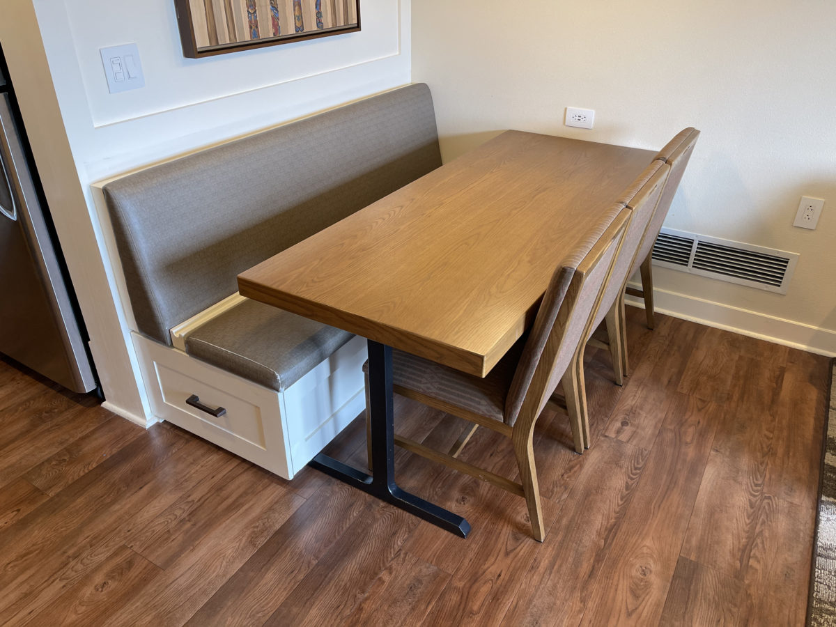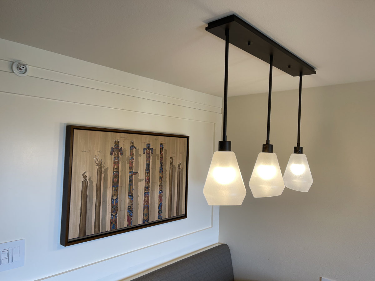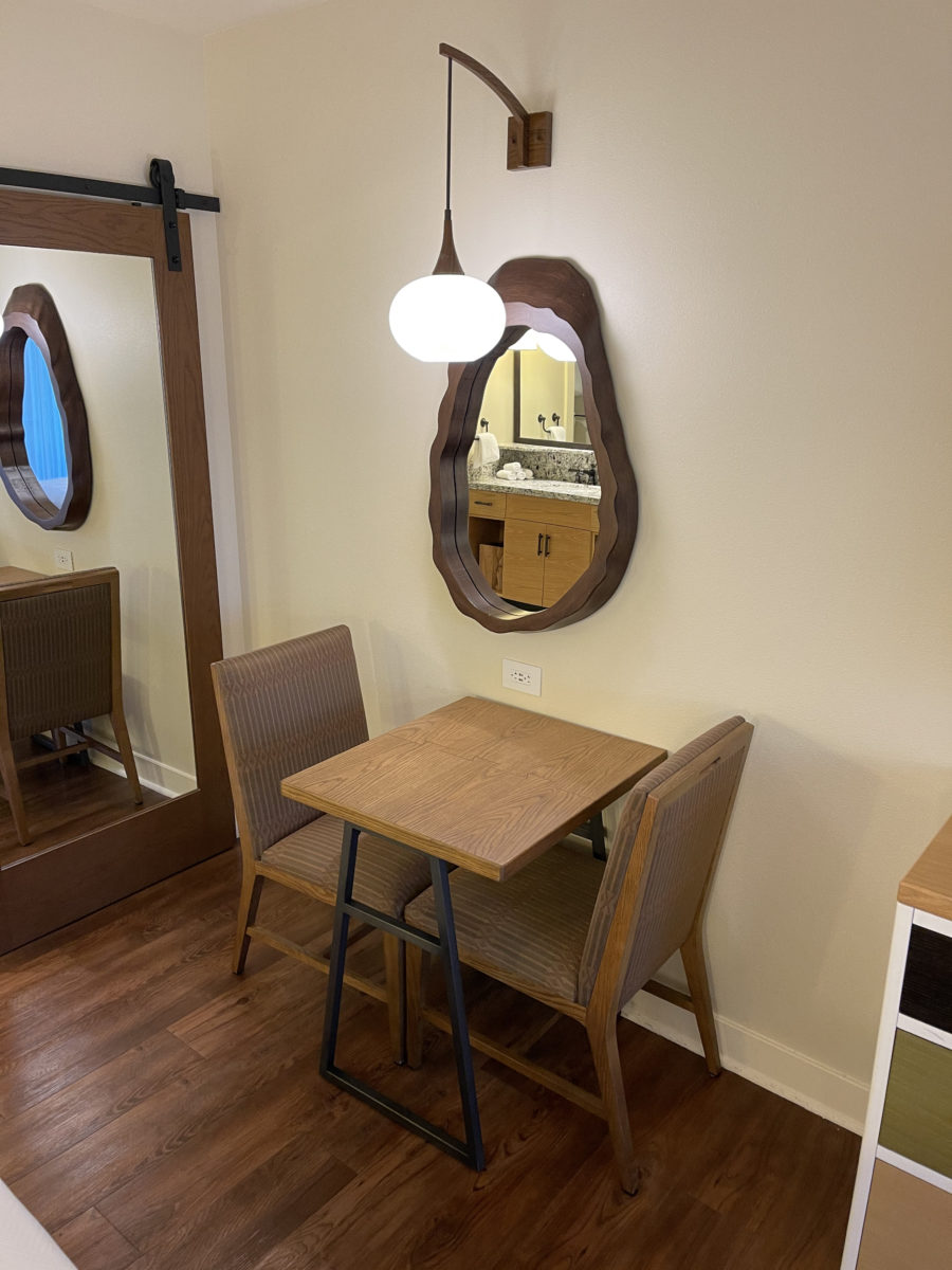 To the side is a small table and two chairs. Above them is a mirror and hanging light. There are also outlets on the wall above the table.