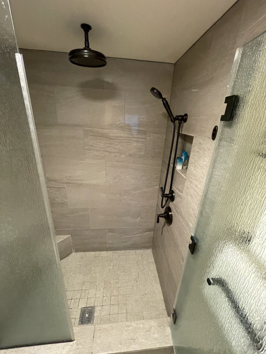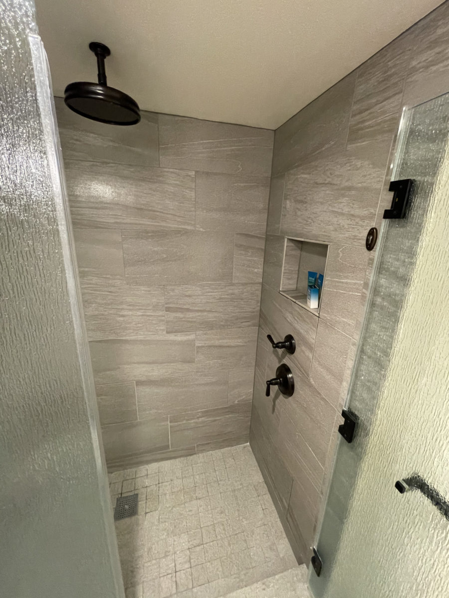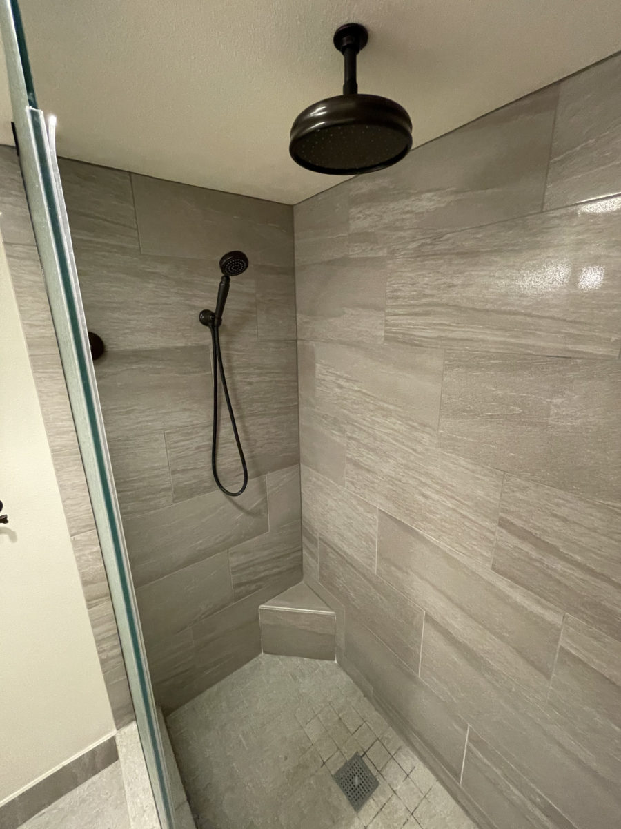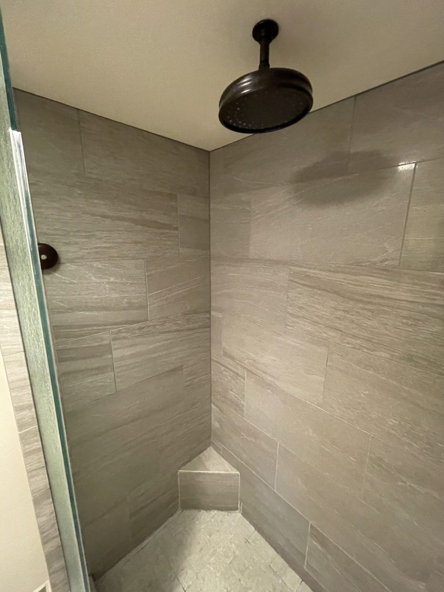 The light fixtures in this bathroom are a little different from the rectangular lanterns we saw in the first bathroom.