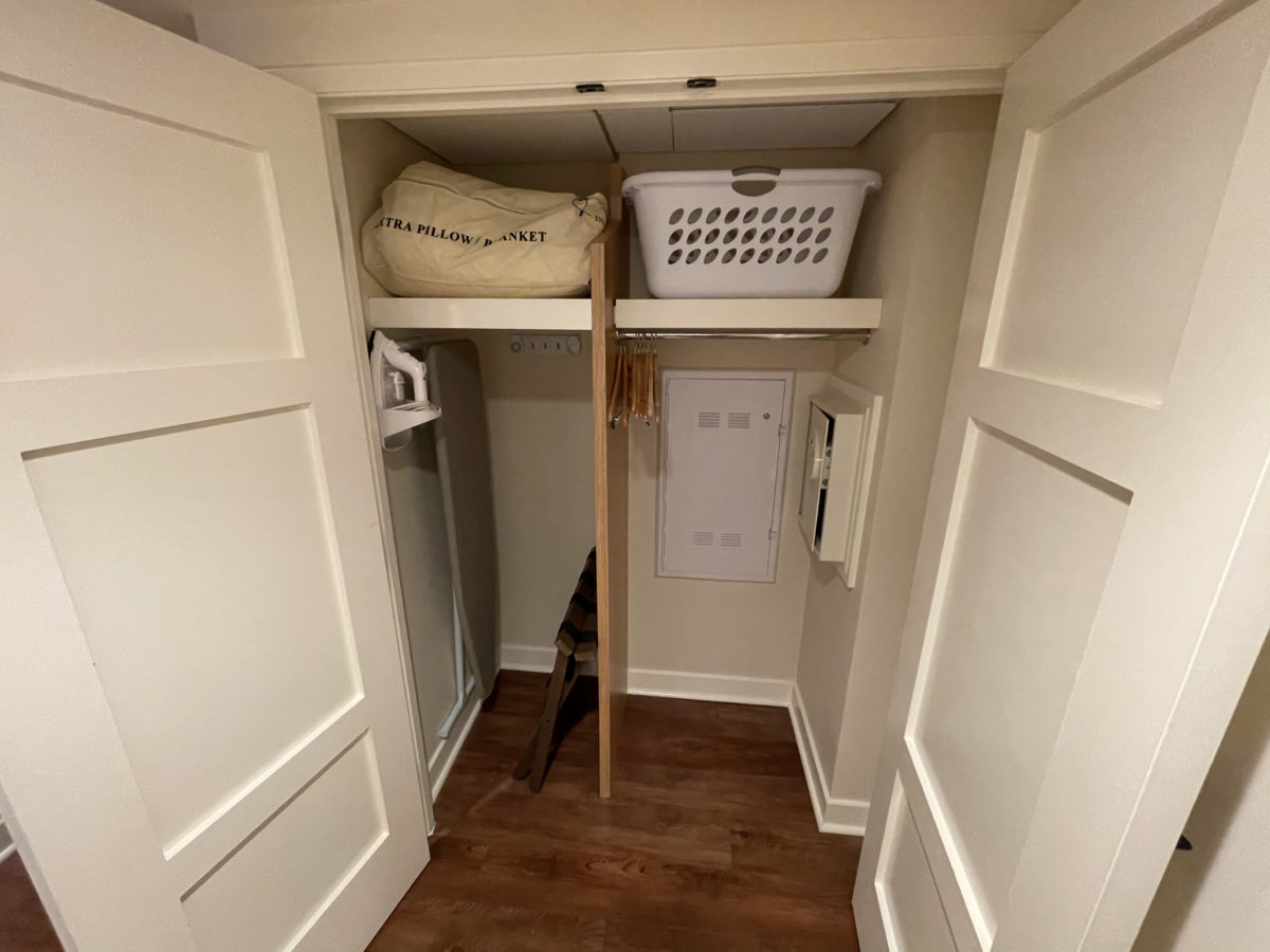 This large closet has extra bedding, a laundry basket, safe, and the ironing set.