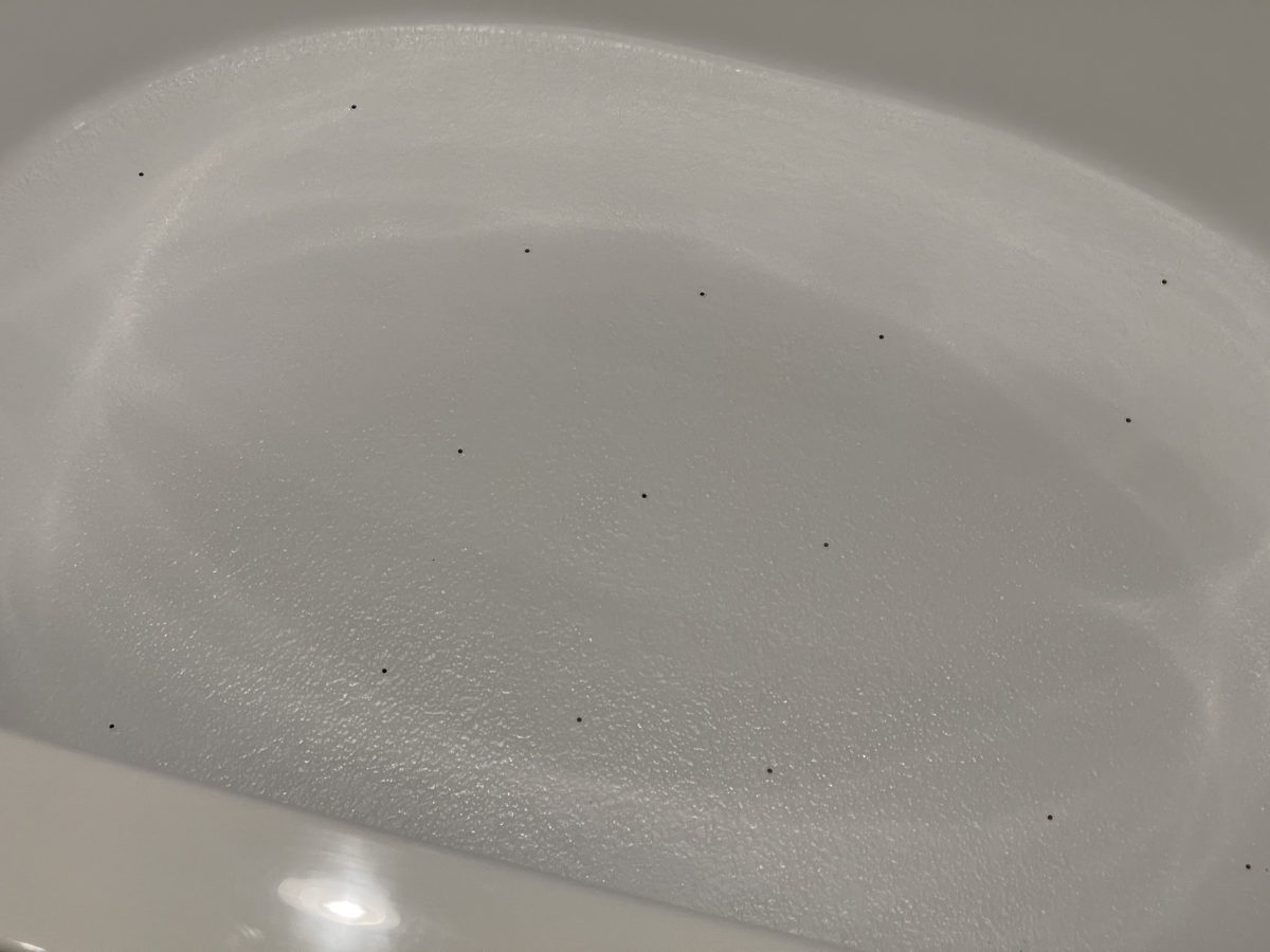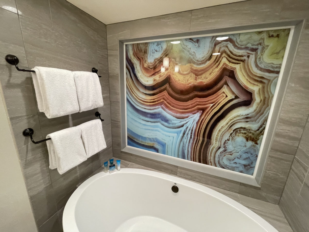 The artwork to the side of the bed is actually the opposite side of the glass art above the tub. It is slightly translucent.