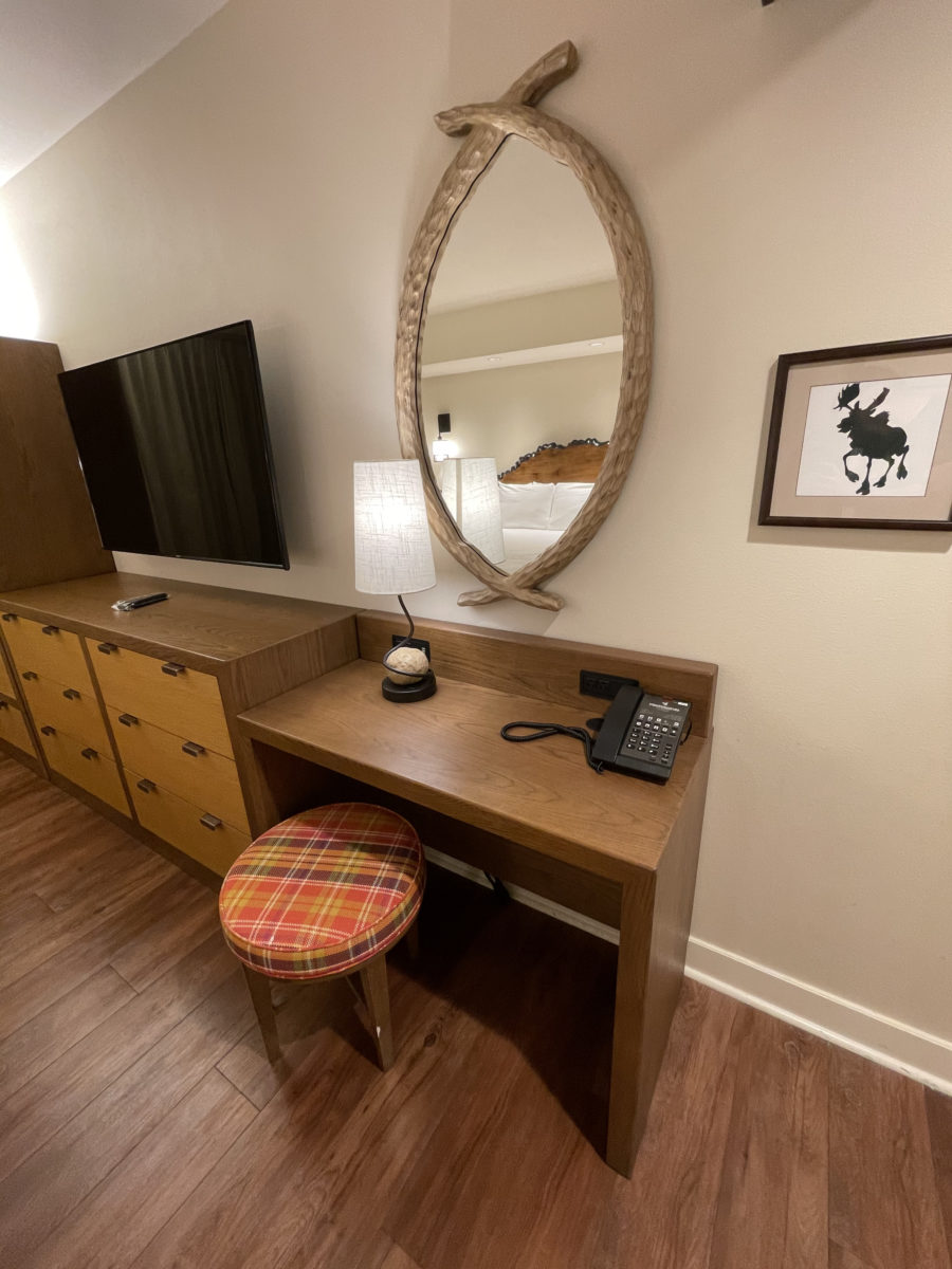 Another mirror is above the desk, which has a stool for a seat instead of a full chair.