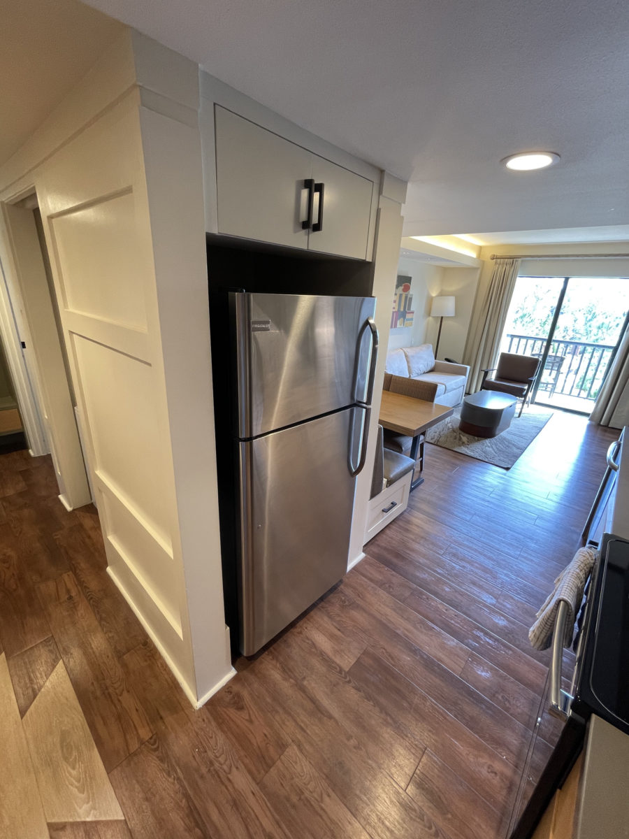 The kitchen unit fits into a hall space leading from the entryway to the living room.