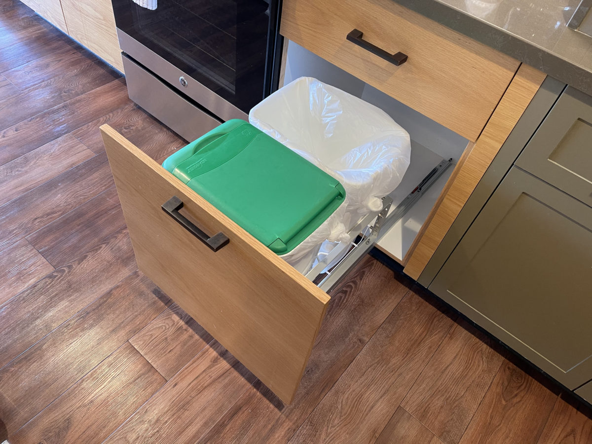 The trashcan and recycling bin are in a large drawer next to the oven.