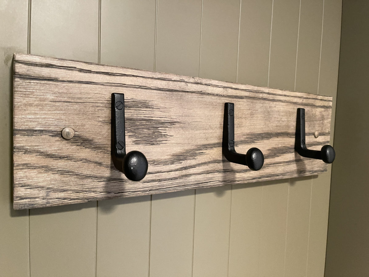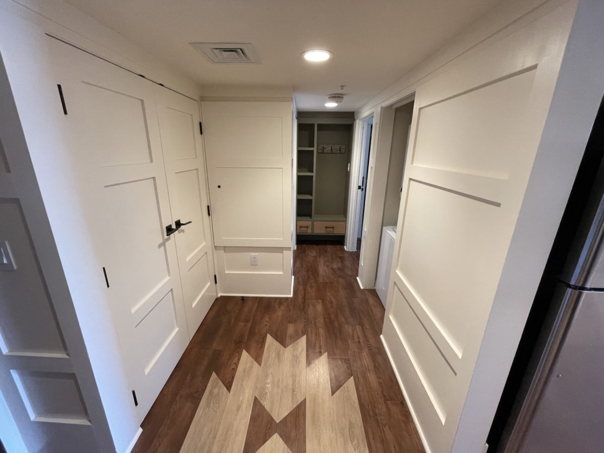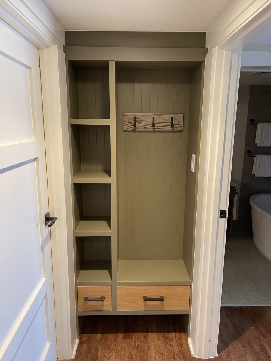 At the end of the hallway is a shelving unit with two drawers and wall hooks. Doors lead into the bathroom on either side of this unit.