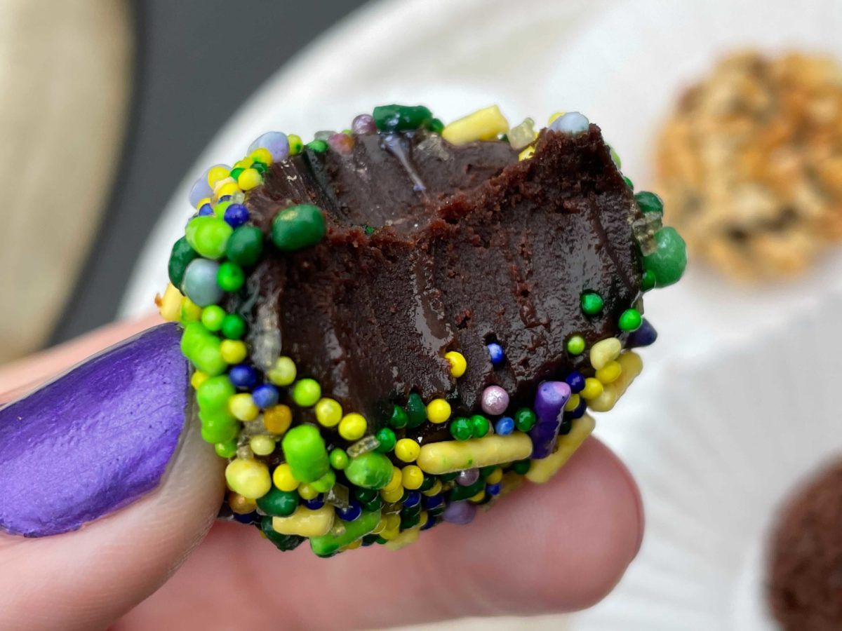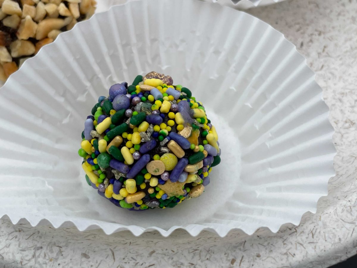 These delightful desserts come with three different toppings: Mardi Gras sprinkles, chocolate sprinkles, or peanuts.