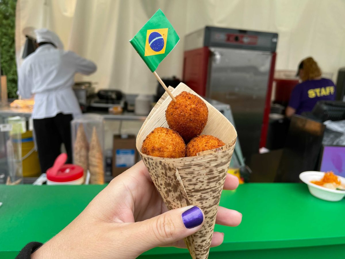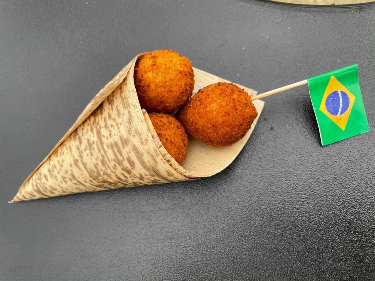 These deep fried bites come in a cone and are topped with the Brazilian flag.