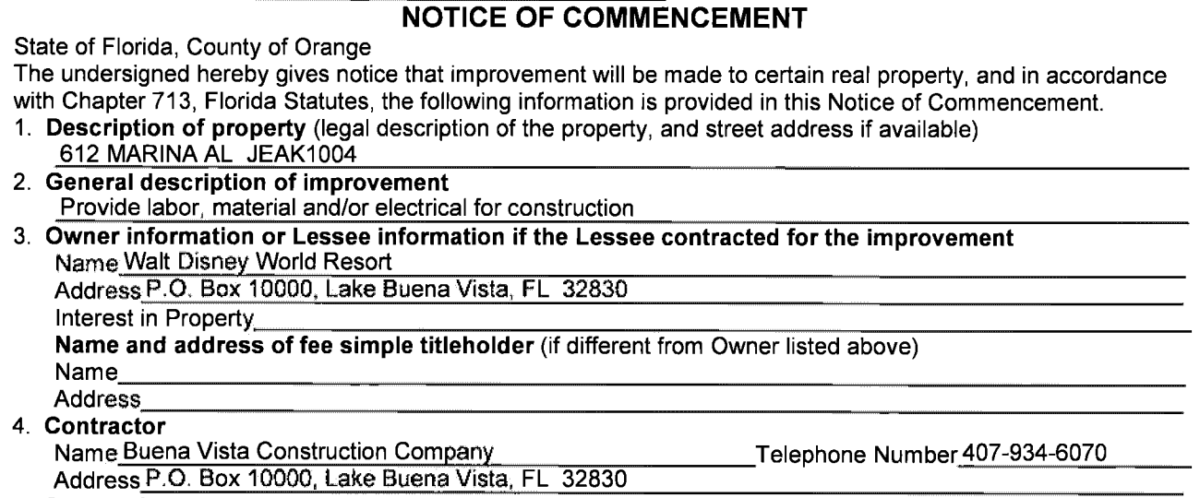 The permit contracts Disney’s in-house Buena Vista Construction Company to “provide labor, material and/or electrical for construction.”