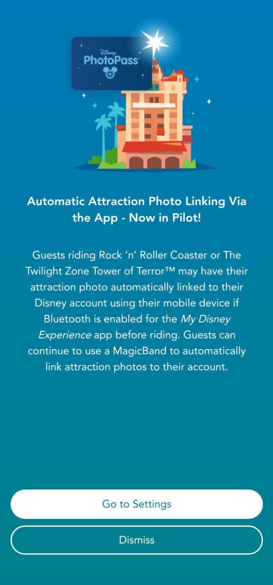 After noticing that we were greeted with a new message on the My Disney Experience homepage about enabling Bluetooth for the new MagicMobile service, we were met with yet another message once we got to Disney’s Hollywood Studios, this time introducing us to Automatic Attraction Photo Linking Via the App.
