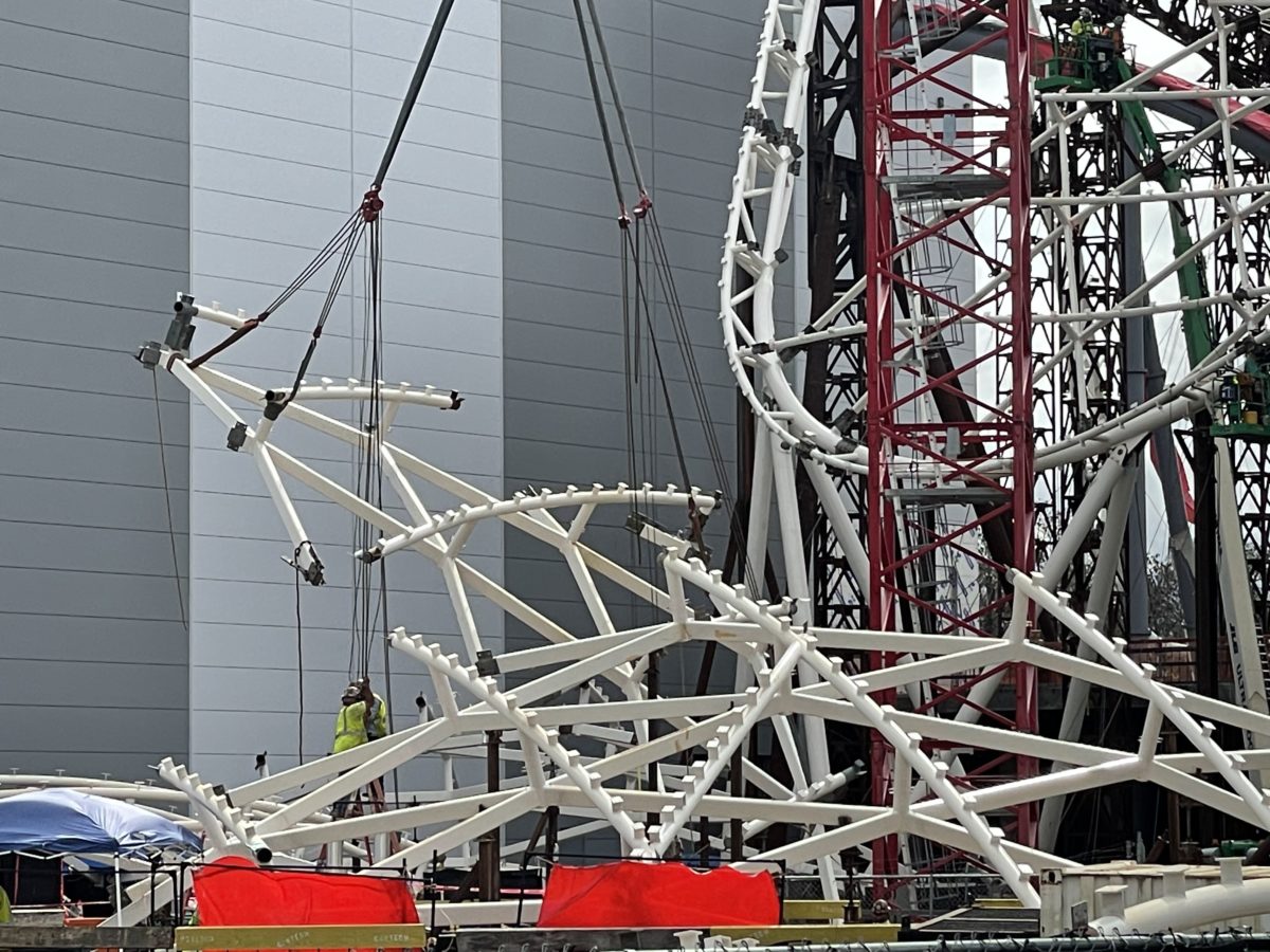 On a more fun construction note: it was pretty cool watching two workers hoist up another part of the TRON Lightcycle / Run canopy to be put into place.