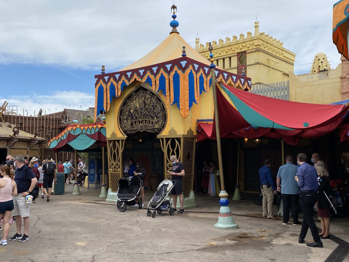 Agrabah Bazaar reopened, but not as the shopping location it was before. The merchandise has been removed, and some tables have been added. We were told by Cast Members that this area will be a place for guests to enjoy their food at standing tables, and also a stroller parking area.