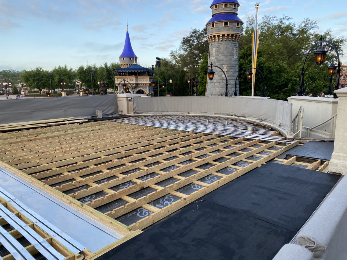 The metal tubing installation continues on Cinderella Castle Stage, with the left side completed to the center point. It now appears that they’re starting from the outside of the right side and working their way towards the center.