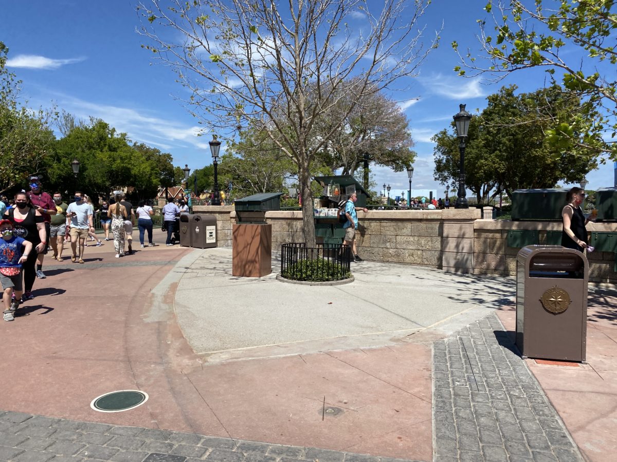 Concrete work continues at the entrance just underneath Spaceship Earth, this time on the right side by Pin Traders.