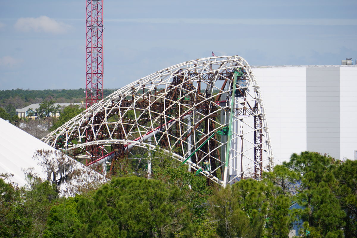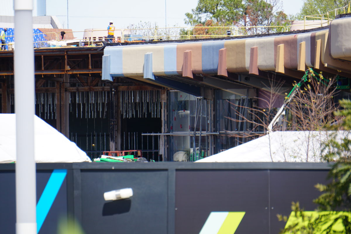 As seen from afar, the TRON Lightcycle / Run illuminated canopy is very close to having all of its pieces in place, but isn’t there just yet. It was actively being worked on today when we went by.