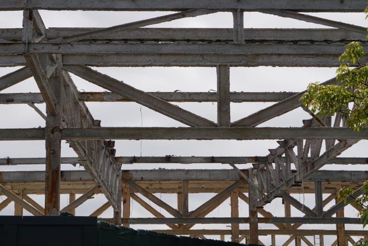 From this angle, you can see just how much of the building has been removed so far with a large empty space in the middle. Workers and heavy machinery equipment can also be seen beyond the construction walls.