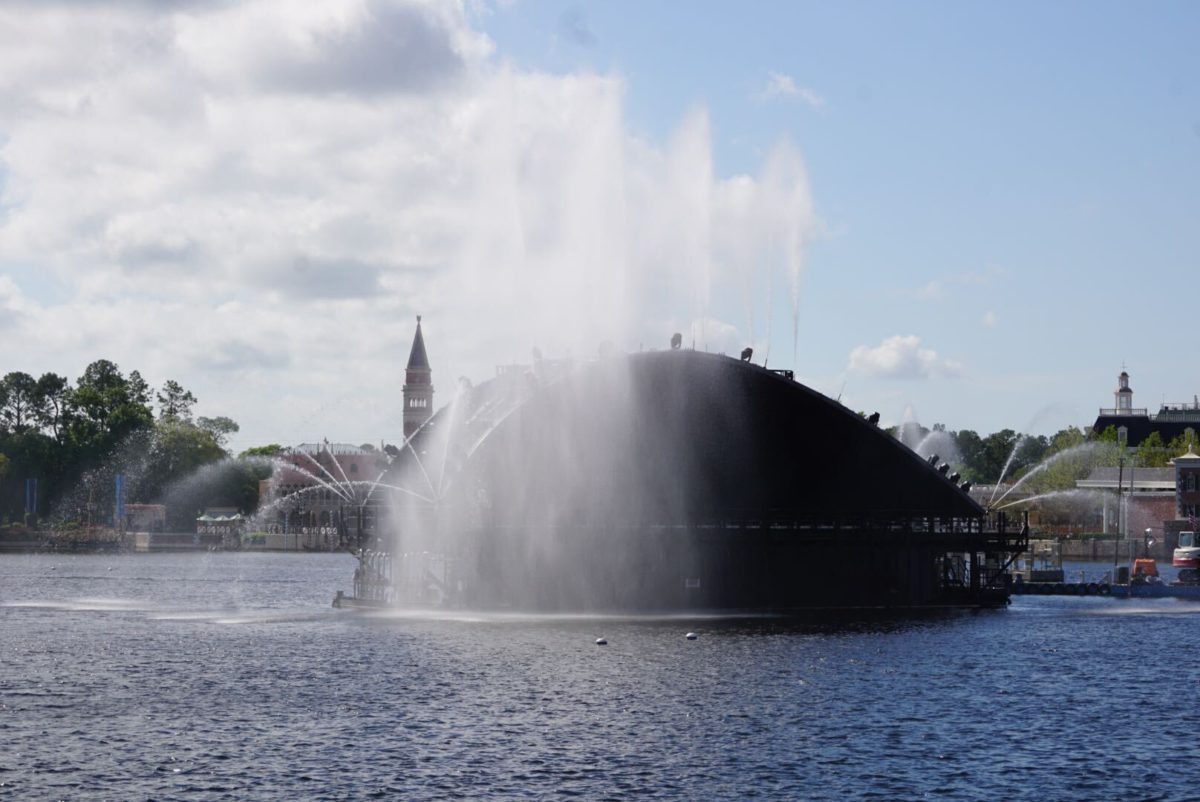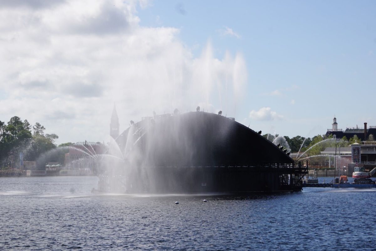 A Harmonious barge was testing its fountains today at EPCOT. The barges will have water and lighting effects that will help comprise the brand new show set to debut sometime this year.