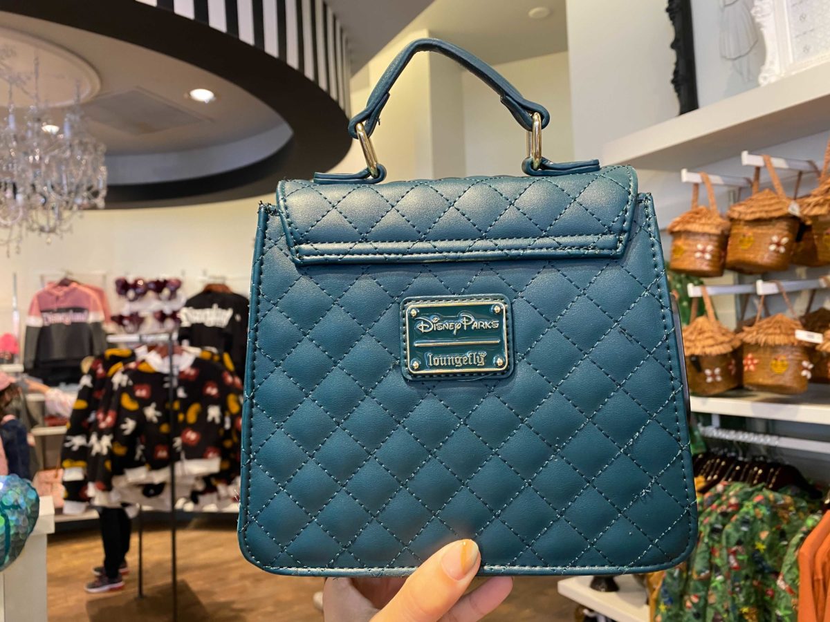 The logo plate for the Loungefly Disney Parks collection is on the back of the purse.