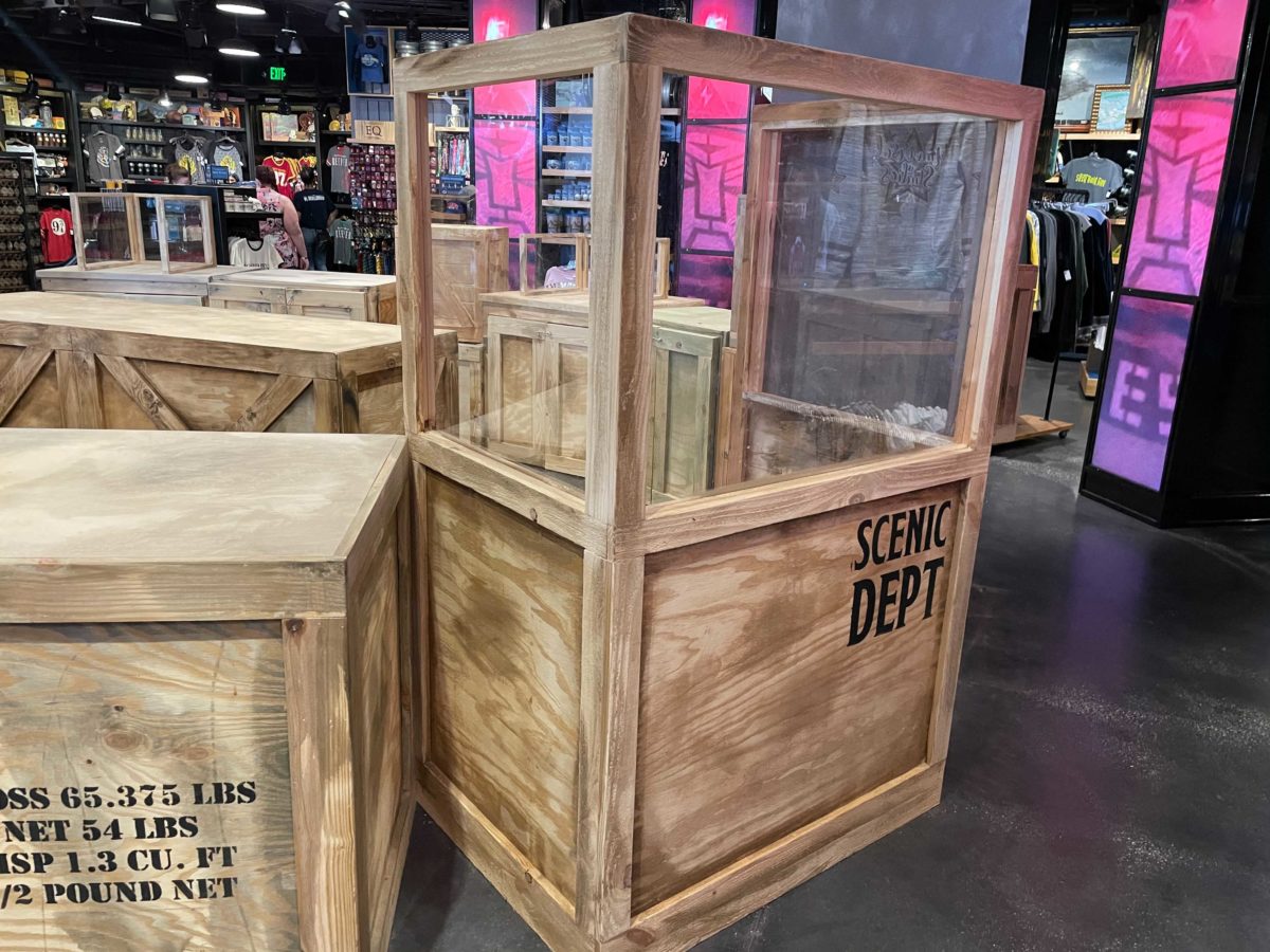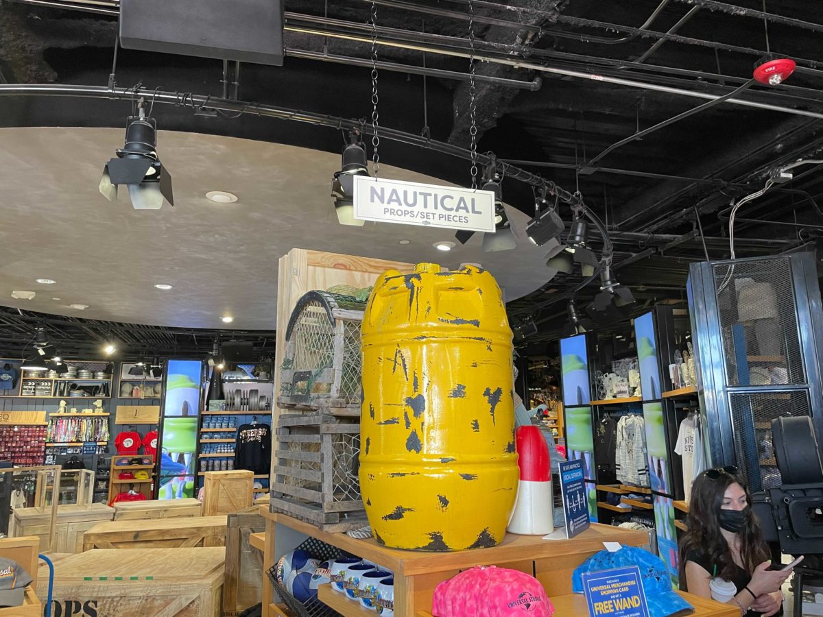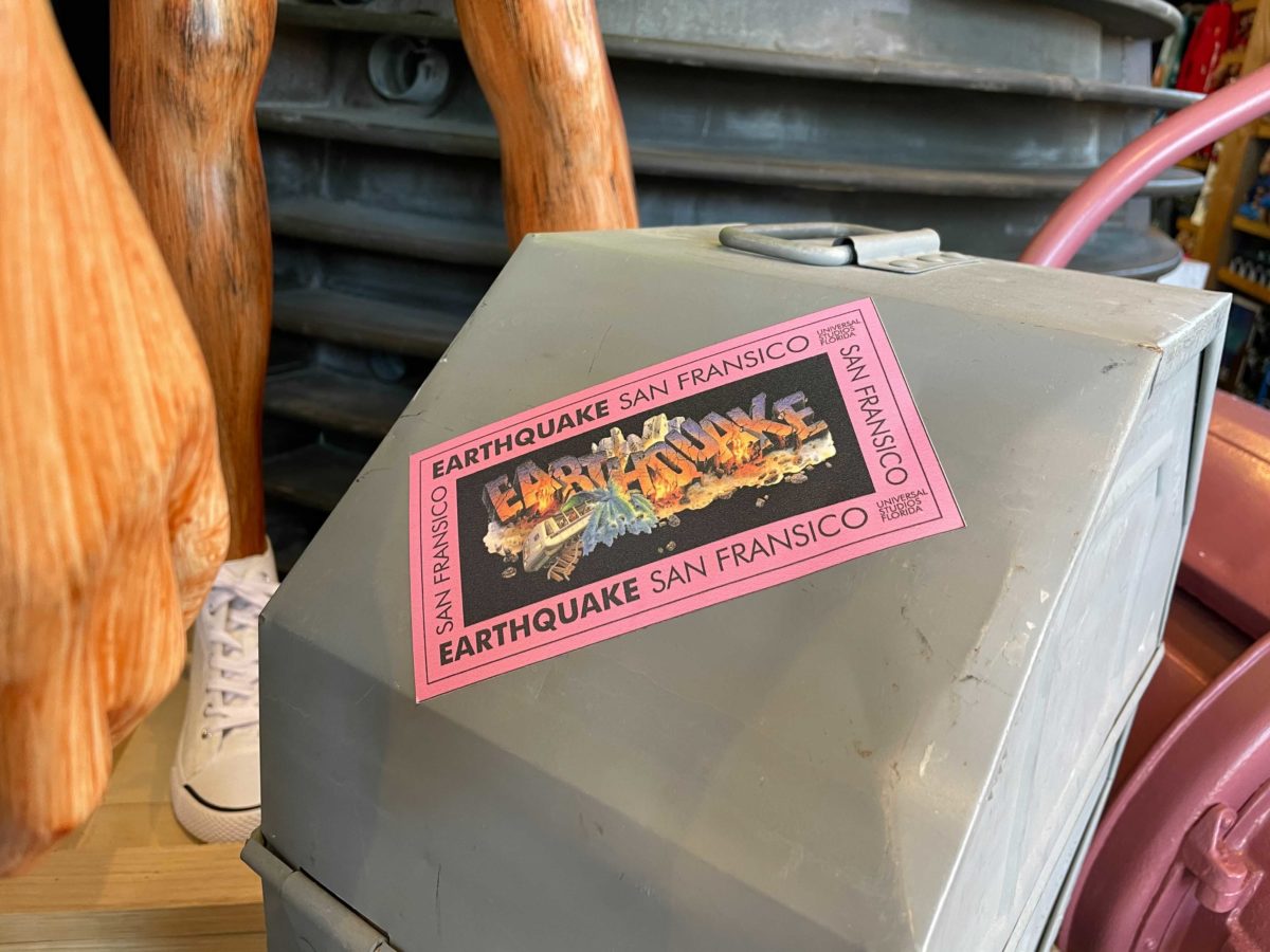 Stickers advertising former Universal Studios attractions like Earthquake: The Big One and Kongfrontation have been added to props throughout the store.