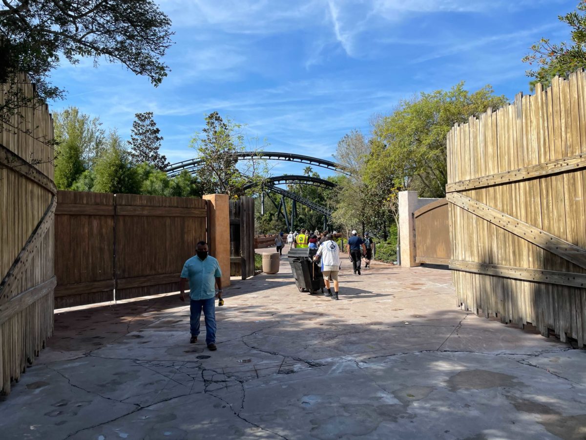 Some walls and temporary shrubs are also still in place, blocking the entrance of the VelociCoaster.