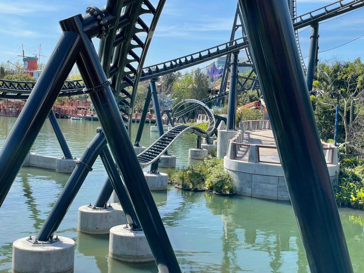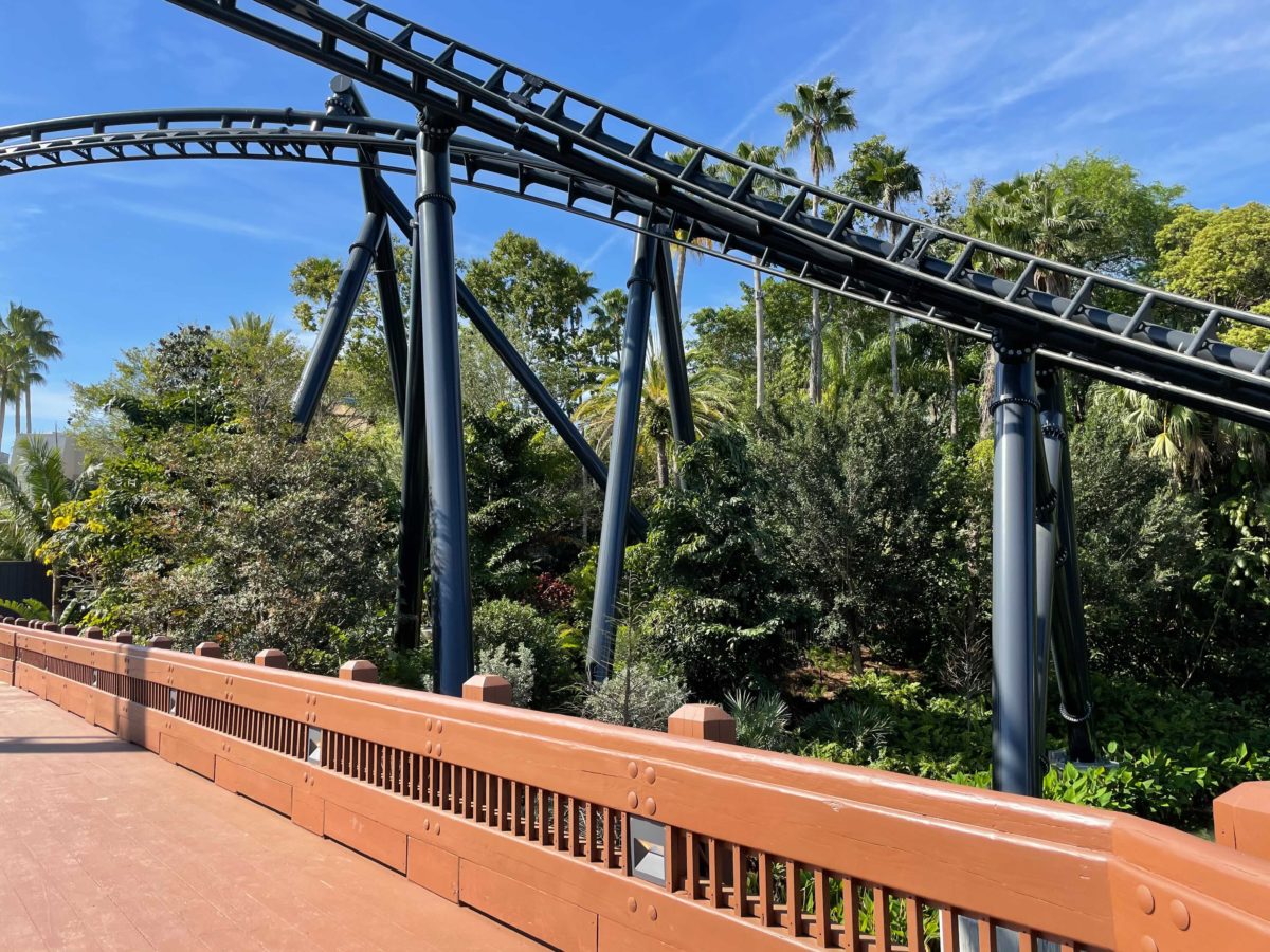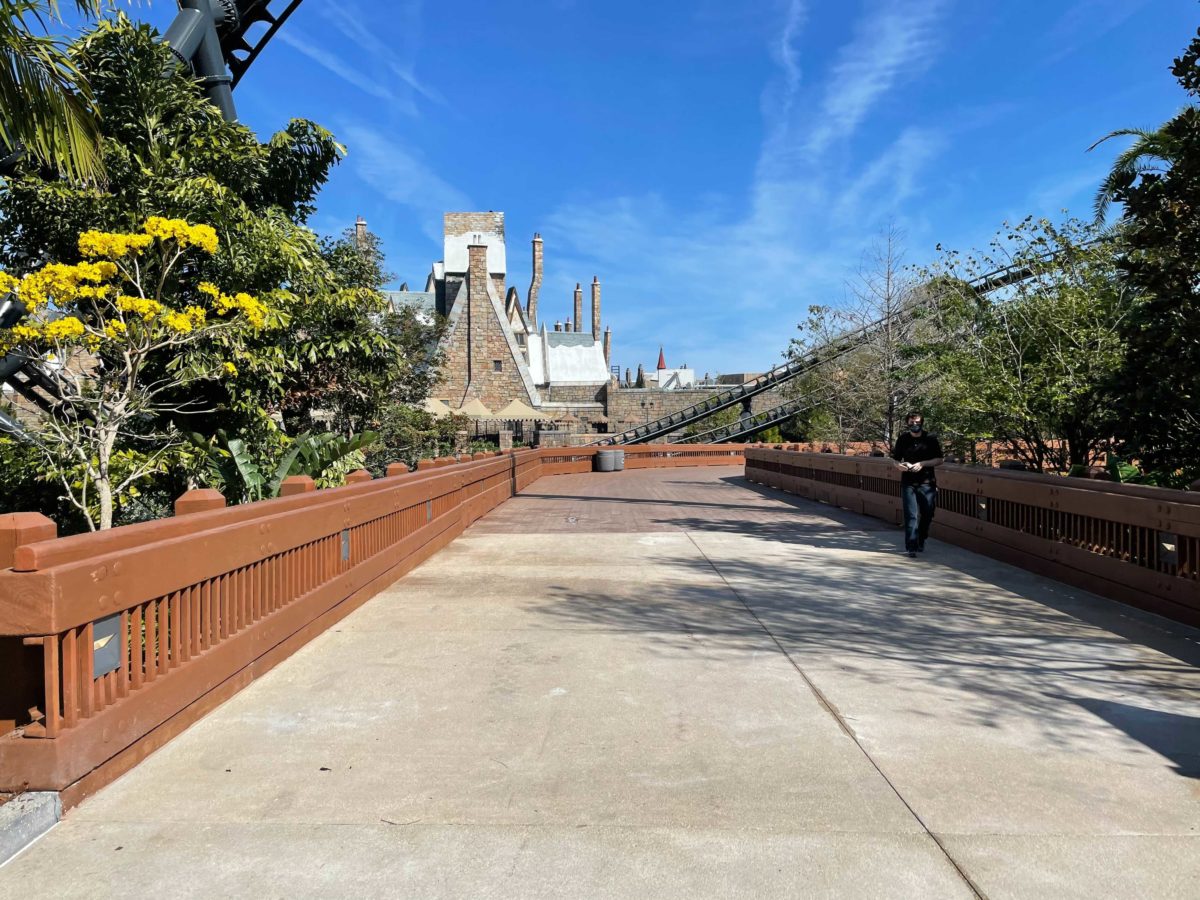 After walls were taken down around the new walkway near Jurassic World VelociCoaster, the bypass bridge has been opened, allowing us to get a better view of the new ride.
