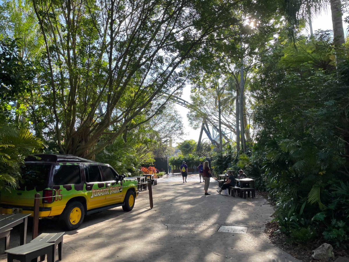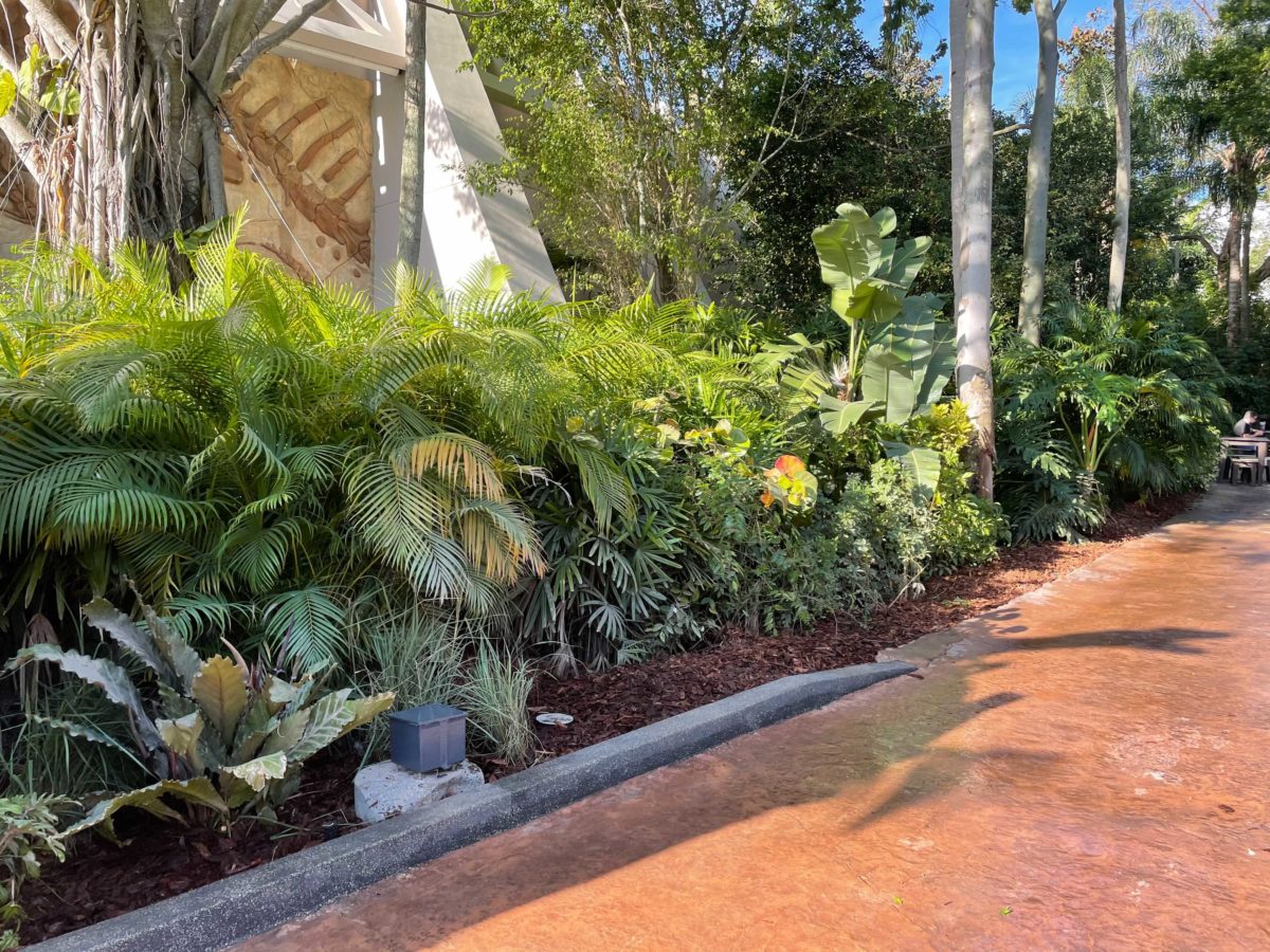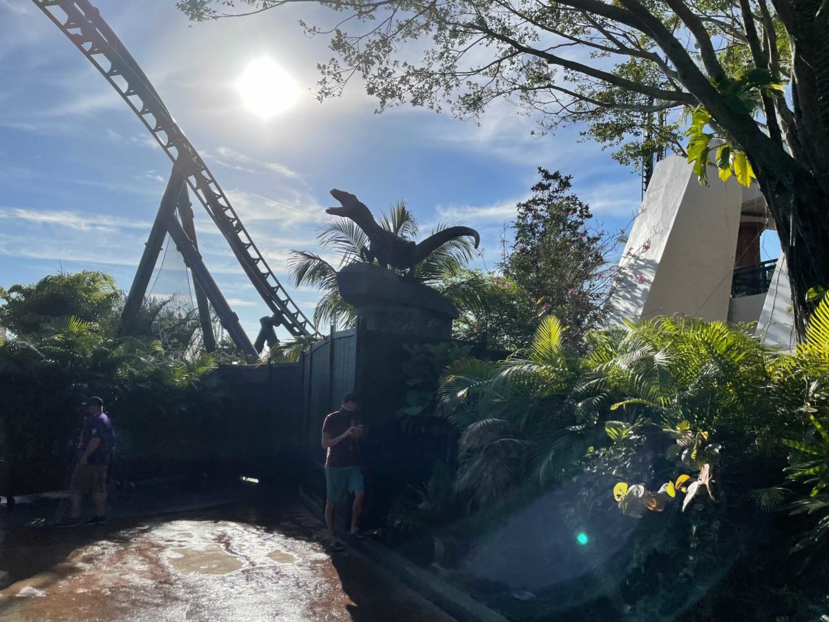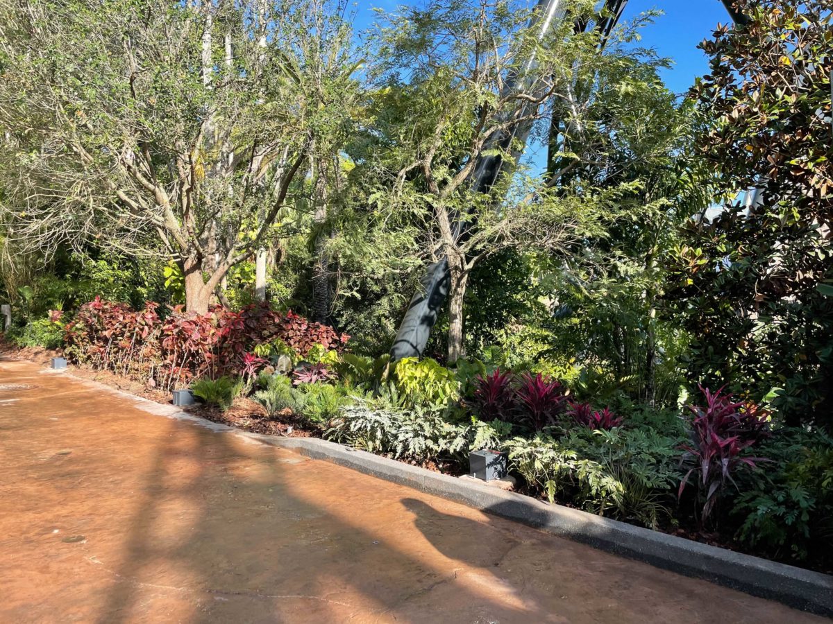 The tropical plants add to the theme of the rollercoaster being set in Jurassic World… or Park…