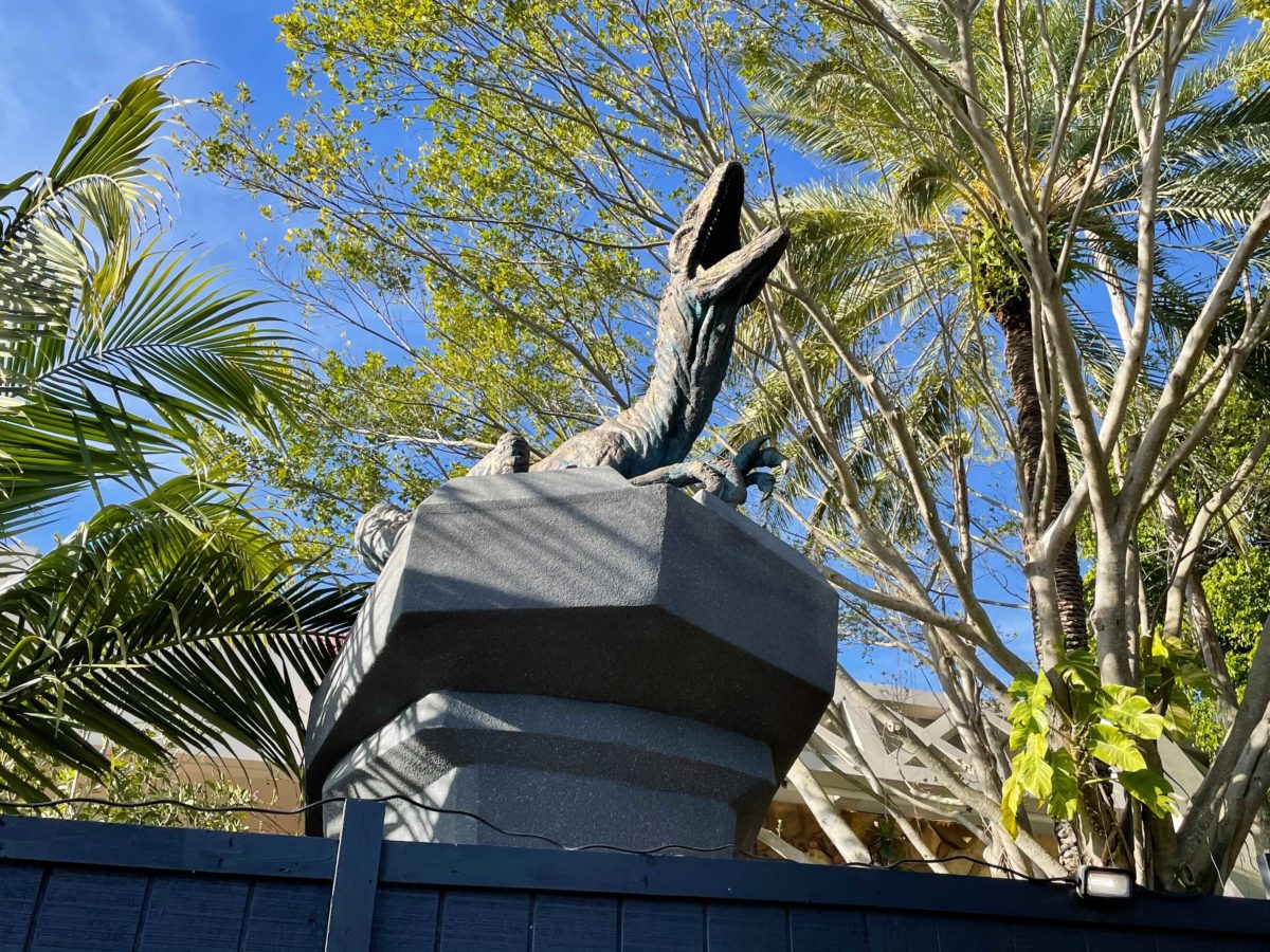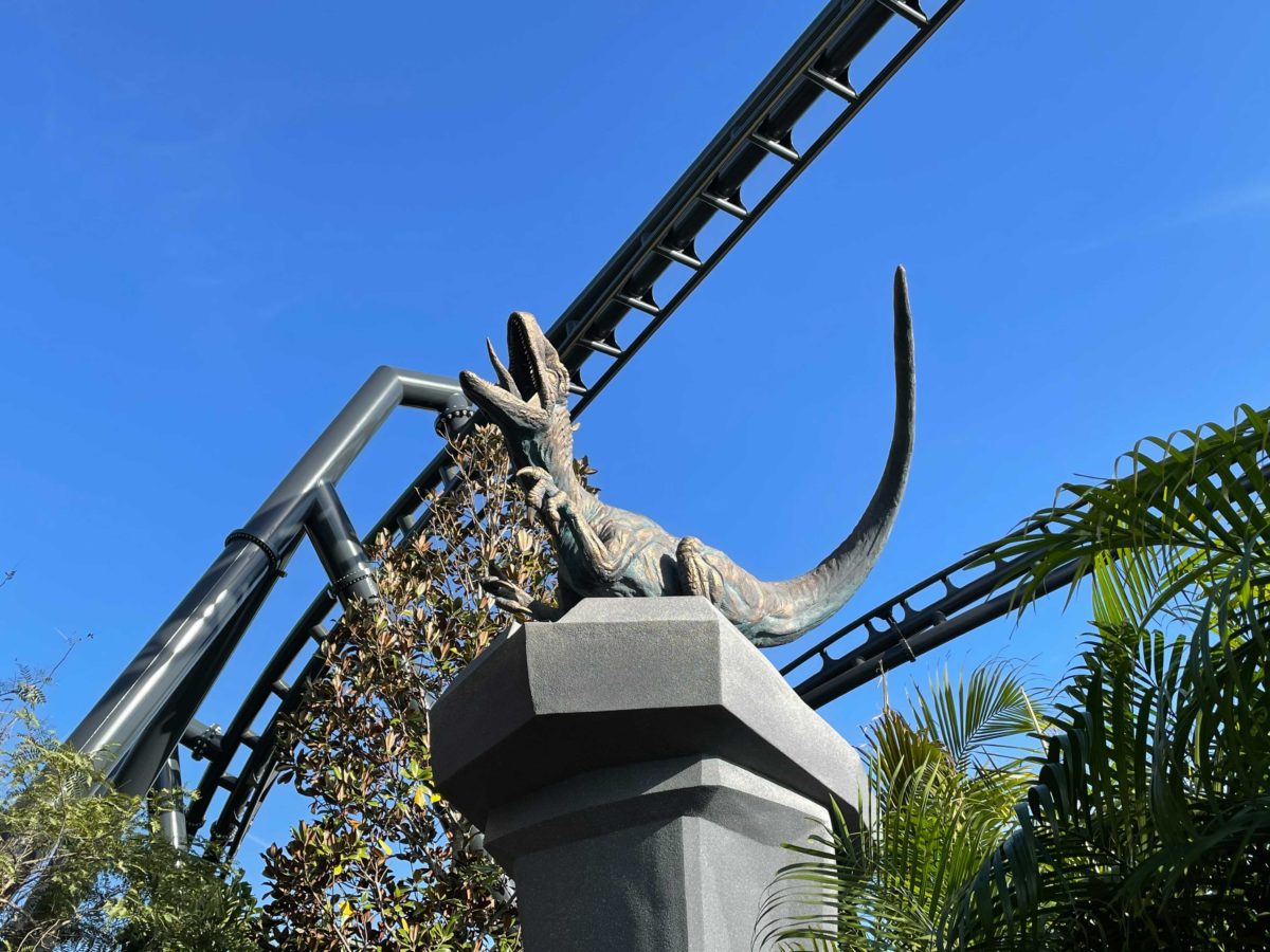 Two velociraptor statues greet guests as they walk the path that would lead to the long-standing Wizarding World bypass bridge.