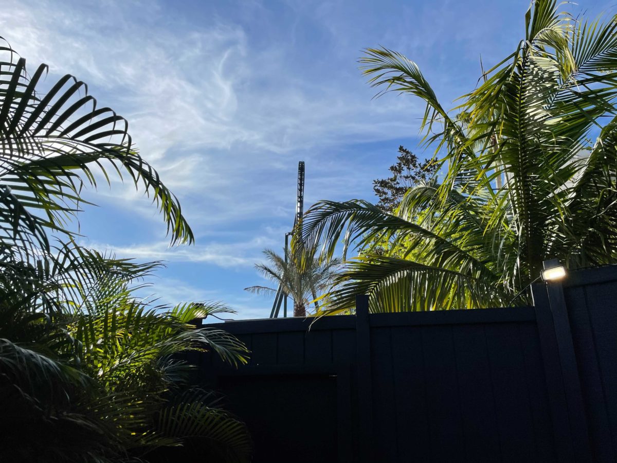 Here you can see the highest point of the VelociCoaster towering above palm trees.