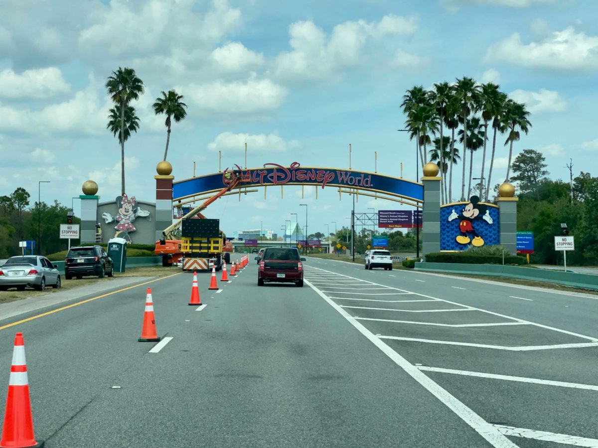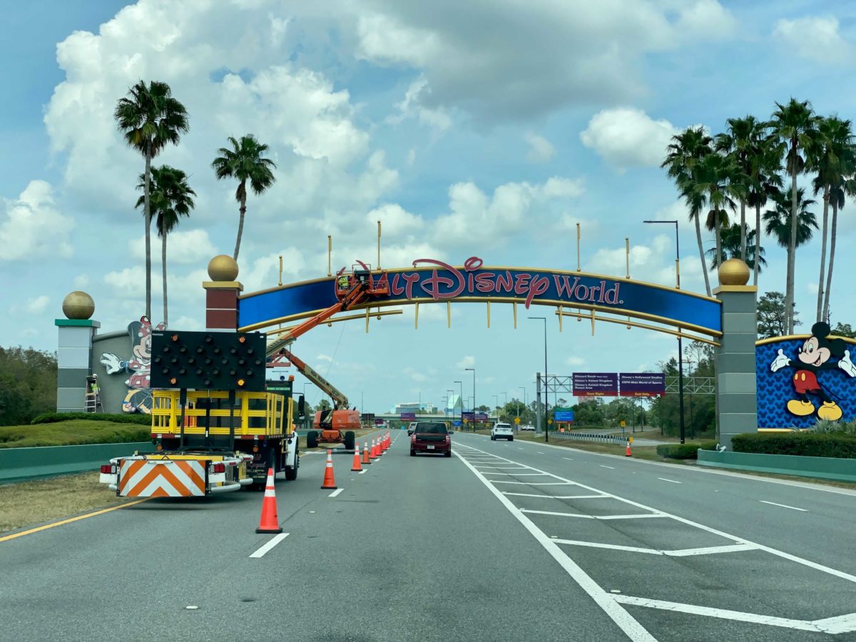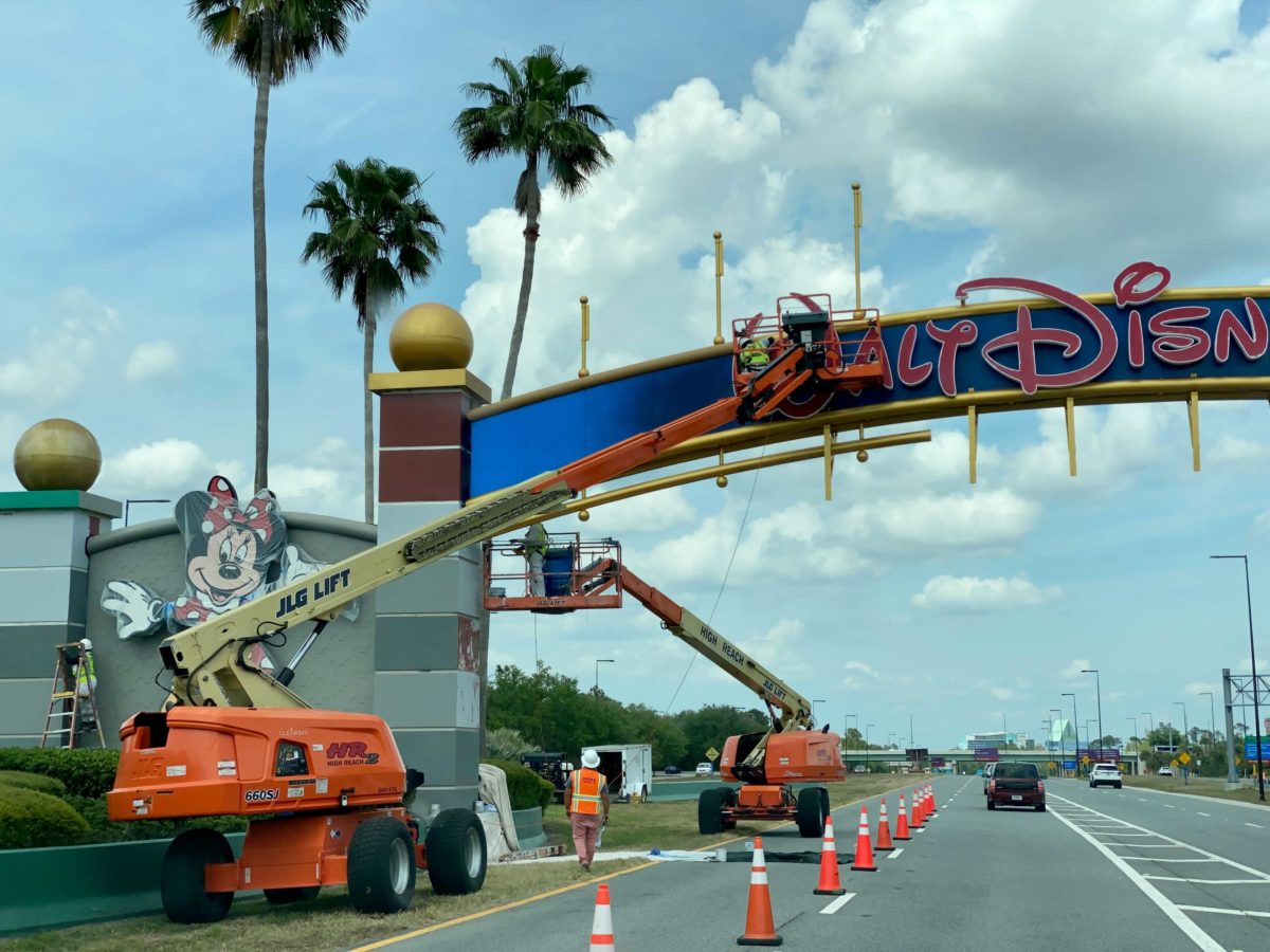 The entrances to Walt Disney World are in the middle of a blue and gold makeover in anticipation of the 50th Anniversary of the Walt Disney World Resort this fall. The entrance to Walt Disney World on World Drive is in the final phases of a refresh as work begins on the Minnie Mouse marquee.