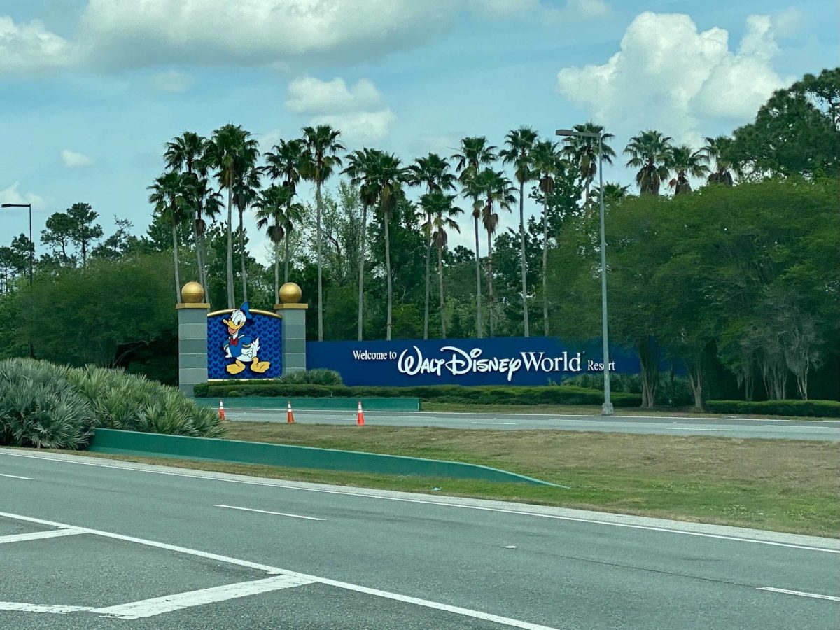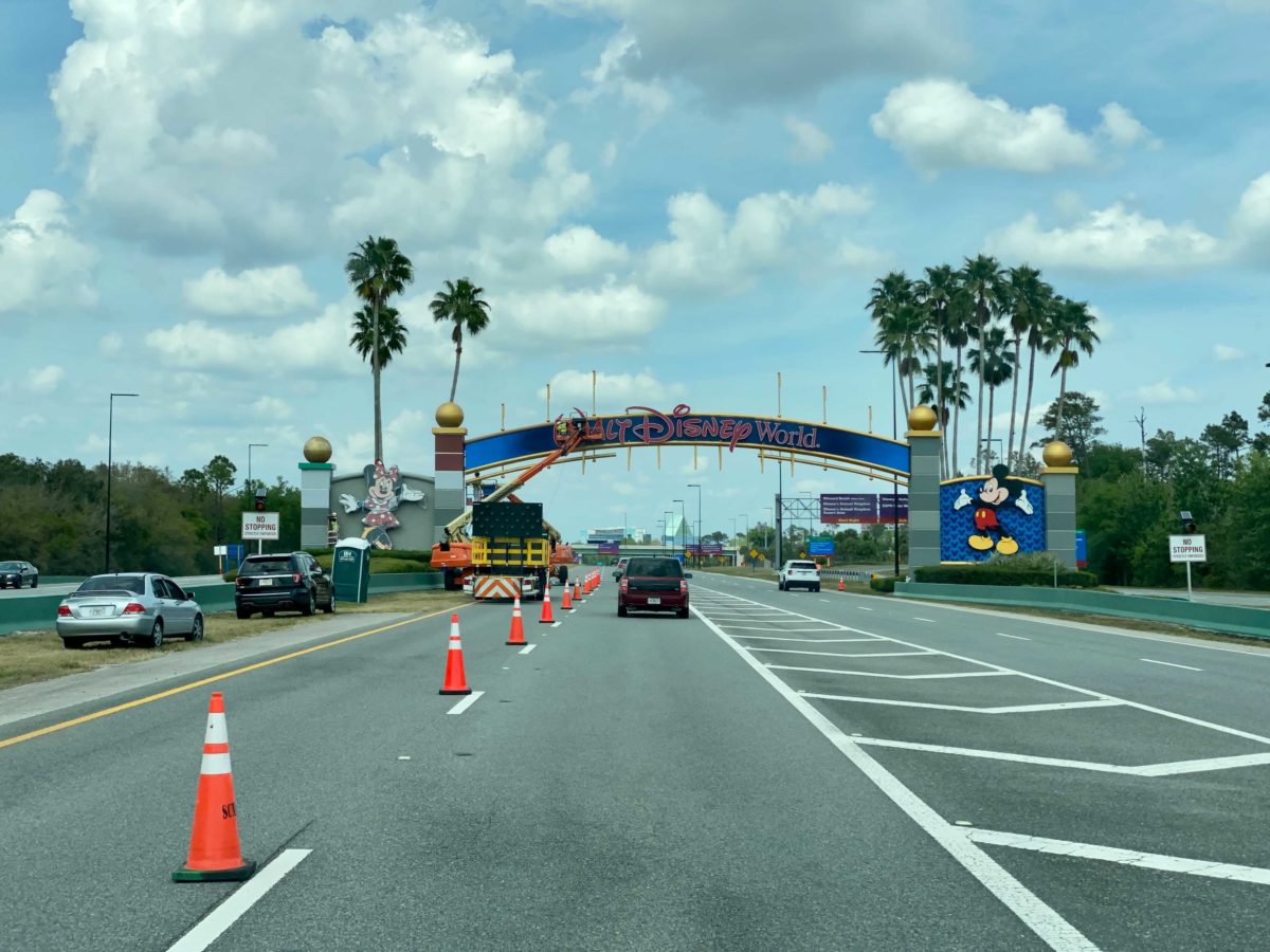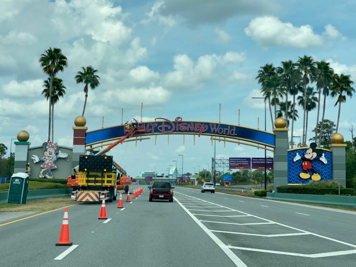 The entrances to Walt Disney World are in the middle of a blue and gold makeover in anticipation of the 50th Anniversary of the Walt Disney World Resort this fall. The entrance to Walt Disney World on World Drive is in the final phases of a refresh as work begins on the Minnie Mouse marquee.