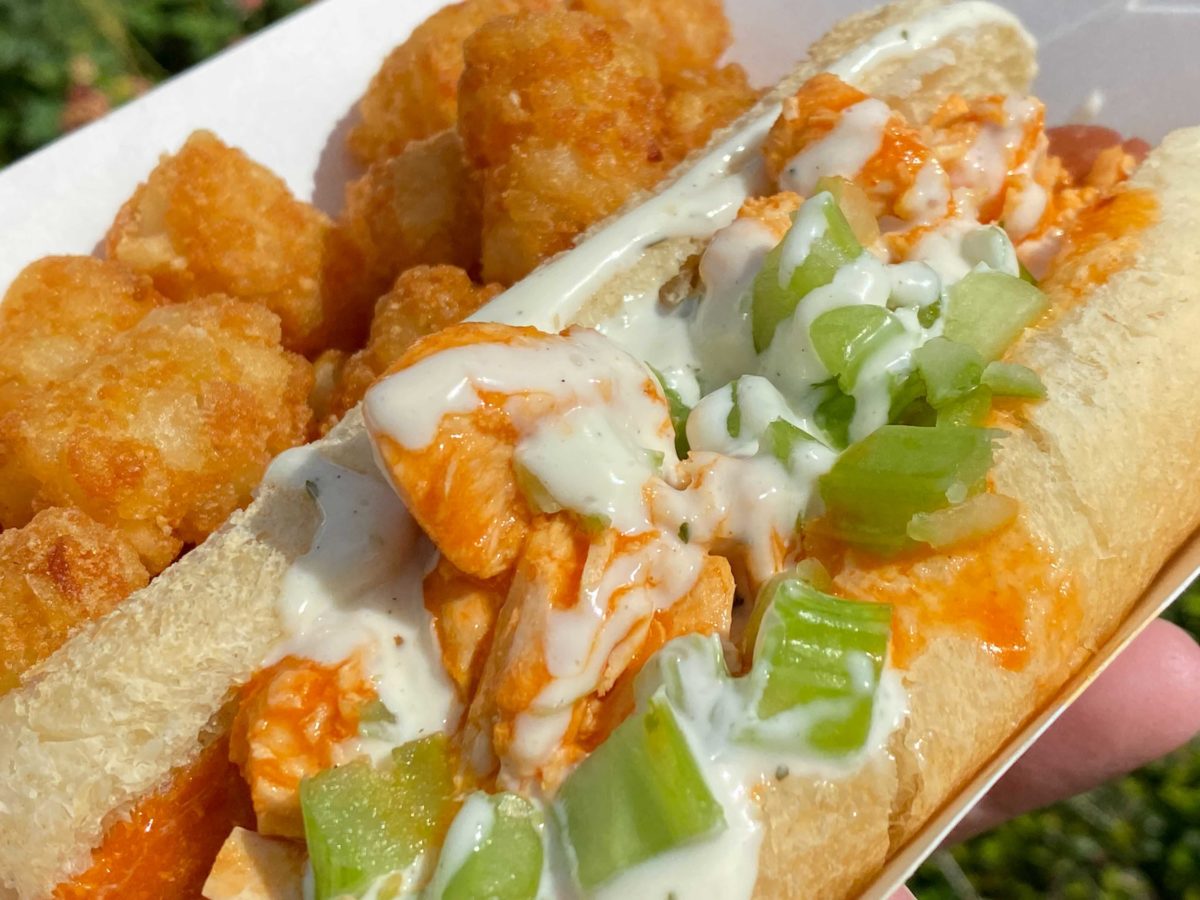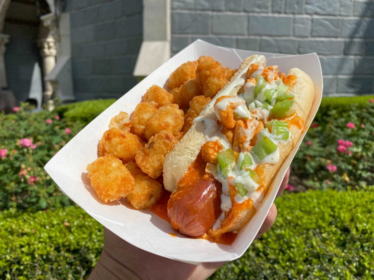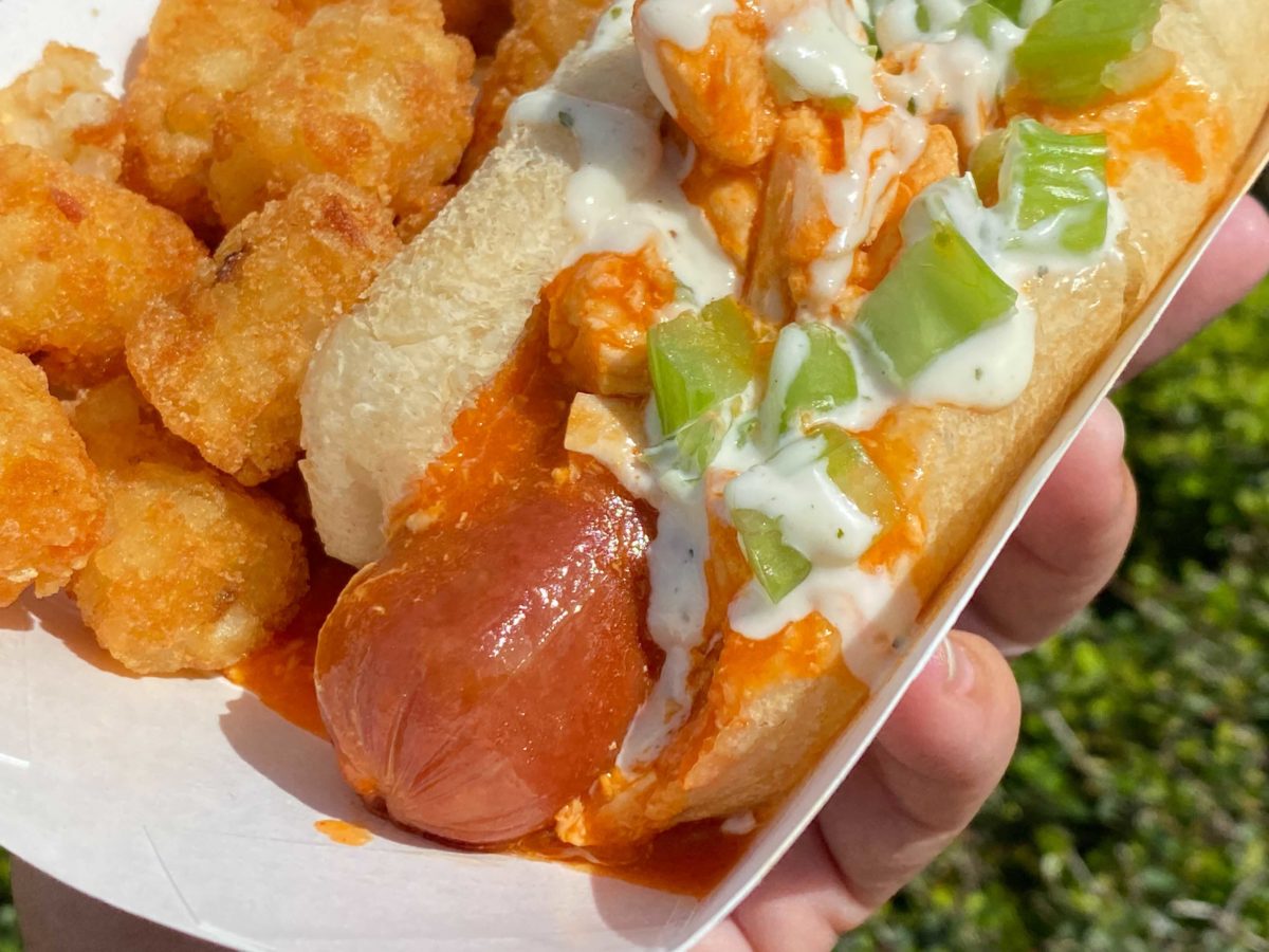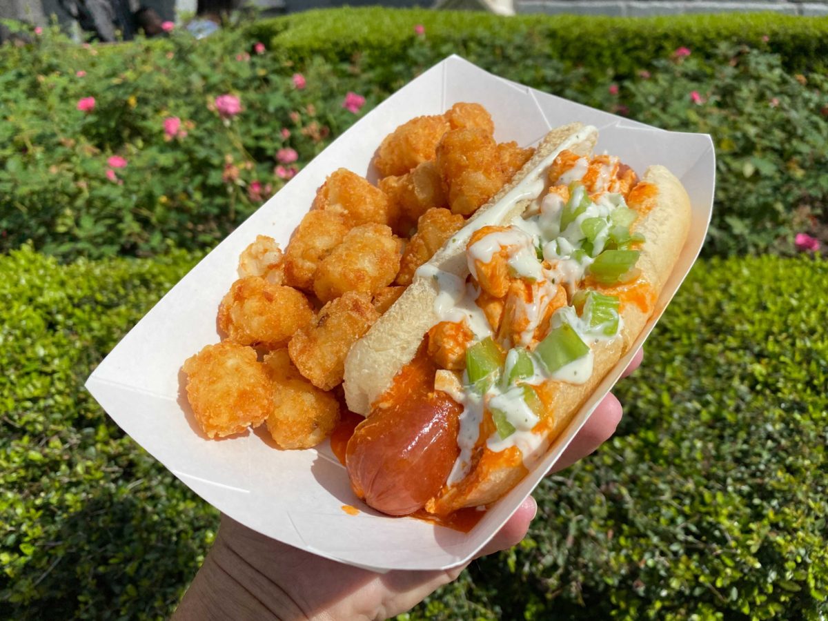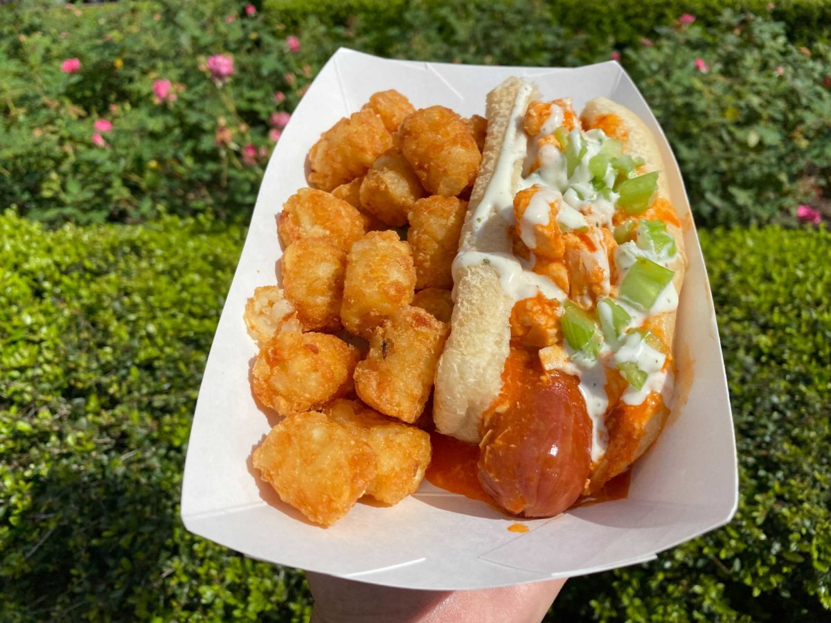 This hot dog is topped with buffalo chicken, celery, blue cheese, and served with tater tots.