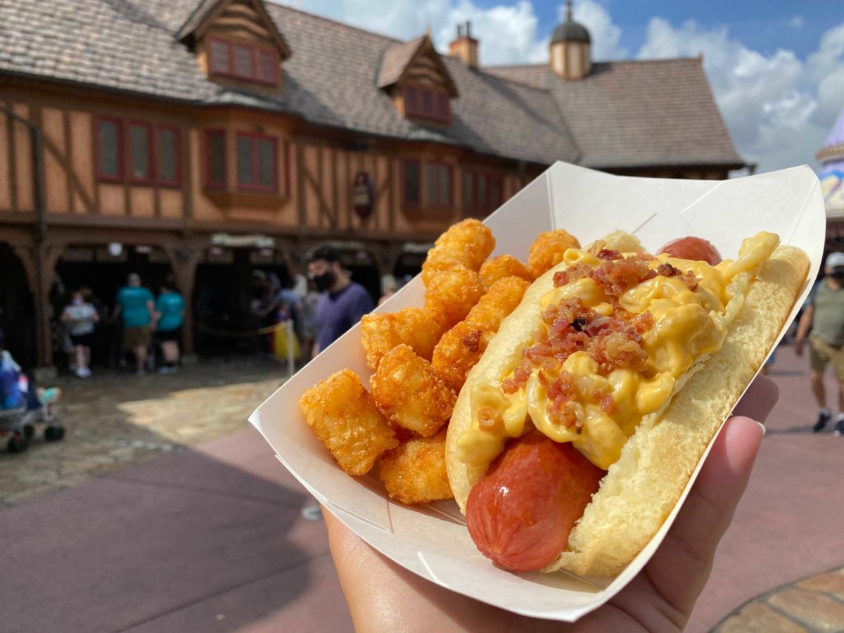 Two brand new loaded hot dogs join the unique menu at The Friar’s Nook in Fantasyland at the Magic Kingdom. While loaded macaroni and cheese and “tater bites” have been a staple at this quick-service dining location lately, new loaded hot dogs are now available as well.