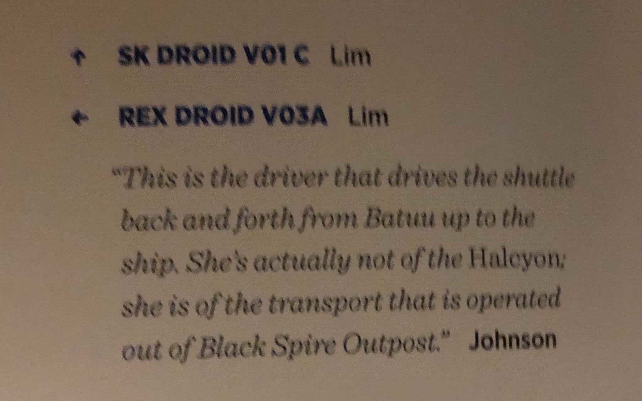 Her name is Rex Droid V03A and she will drive the shuttle transporting guests back and forth from Batuu up to the Galactic Starcruiser. She’s not “actually of the Halcyon; she is of the transport that is operated out of Black Spire Outpost.”