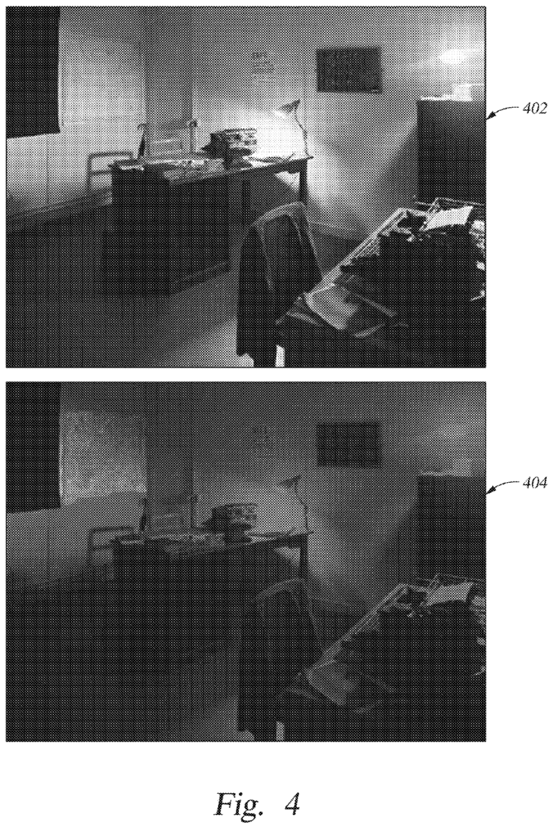 Fig. 4 shows the same real-world office scene. The top image (402) does not include the virtual lighting effects. With the rendered lighting effects, the office lighting becomes starker (404). This is the only example provided in the patent application.