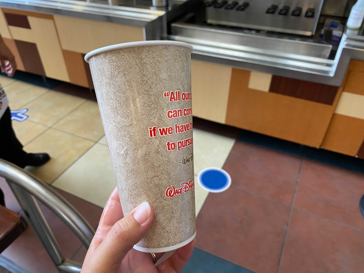 A gloved Cast Member may then hand a cup to the guest, depending on location. Guests with refillable resort mugs can bring theirs up instead.