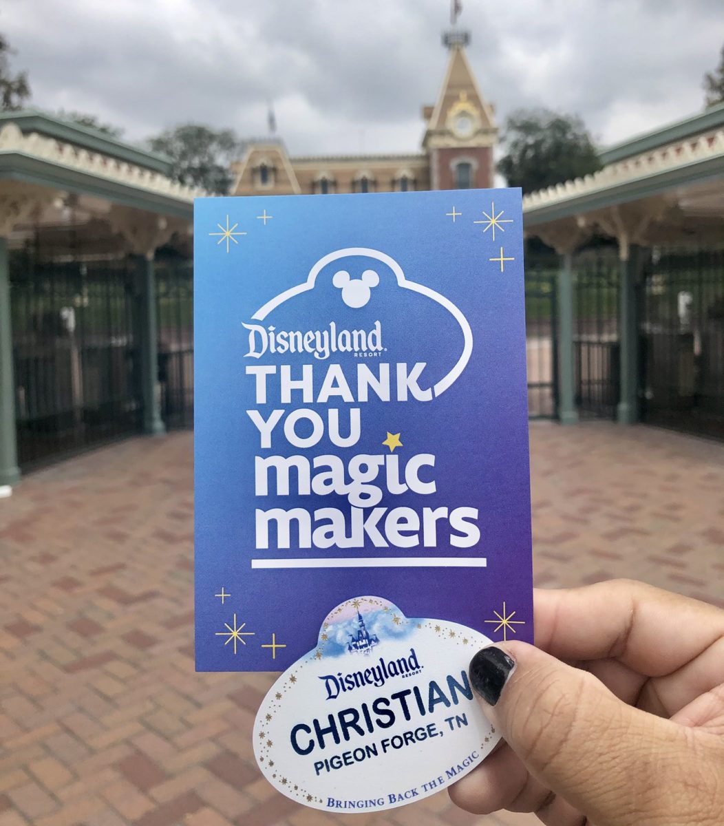 “Bringing Back The Magic” replaces “Where Dreams Come True” along the bottom of the name tag. Christian also shared a “Thank you, Magic Makers” postcard from Disneyland Resort.