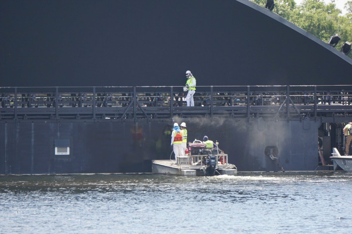 Painters on this side seemed to be working on the yellow strip visible above the barge’s platform.