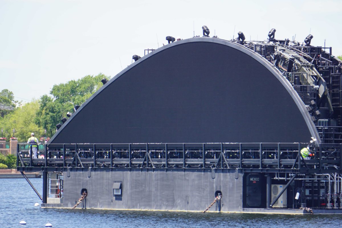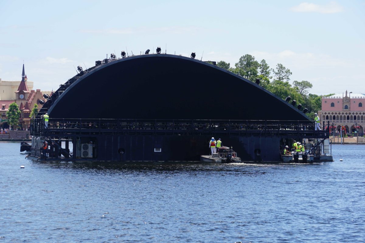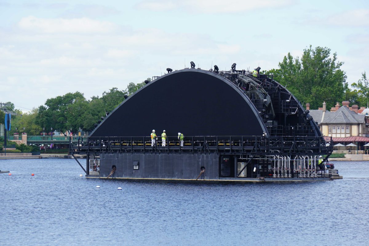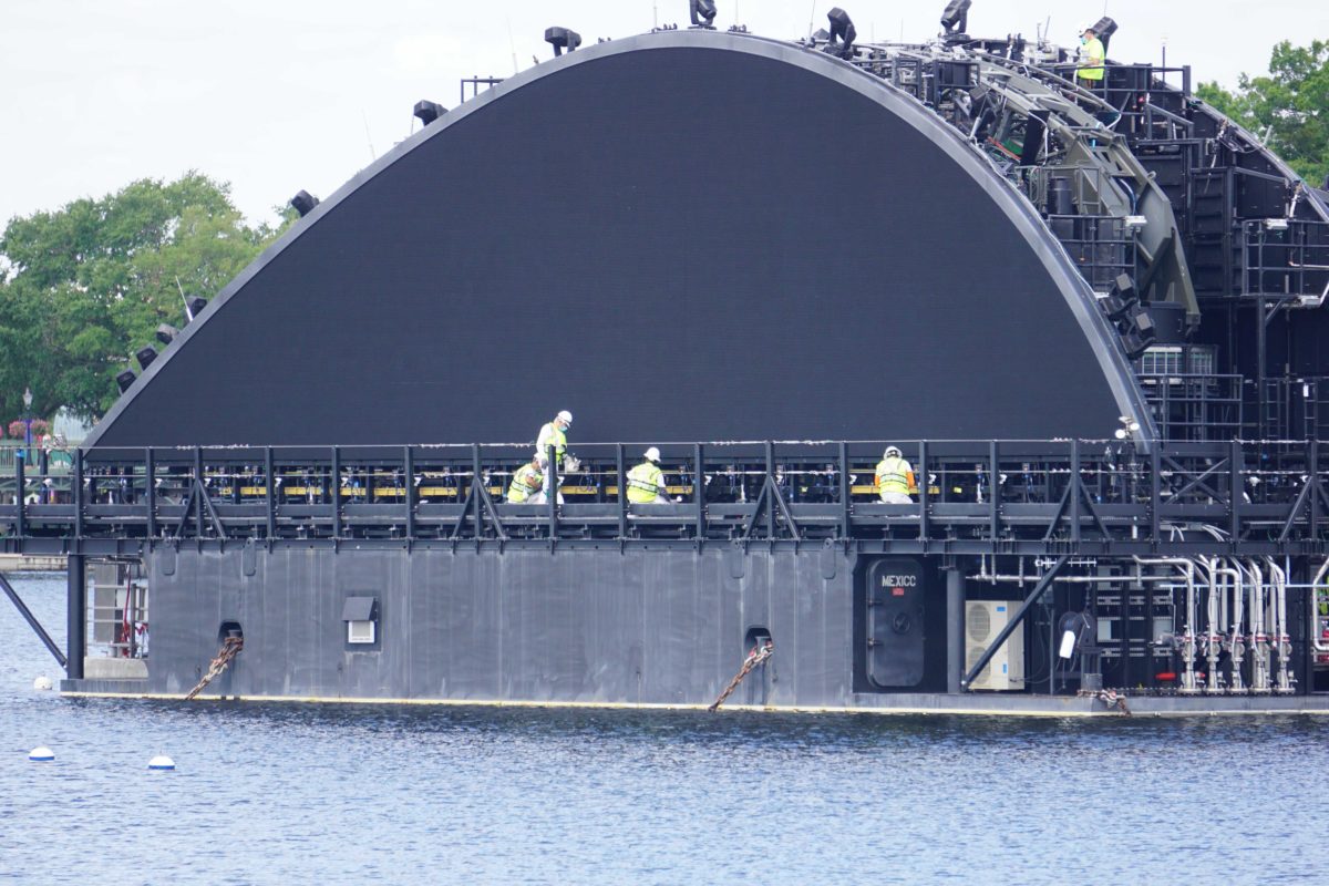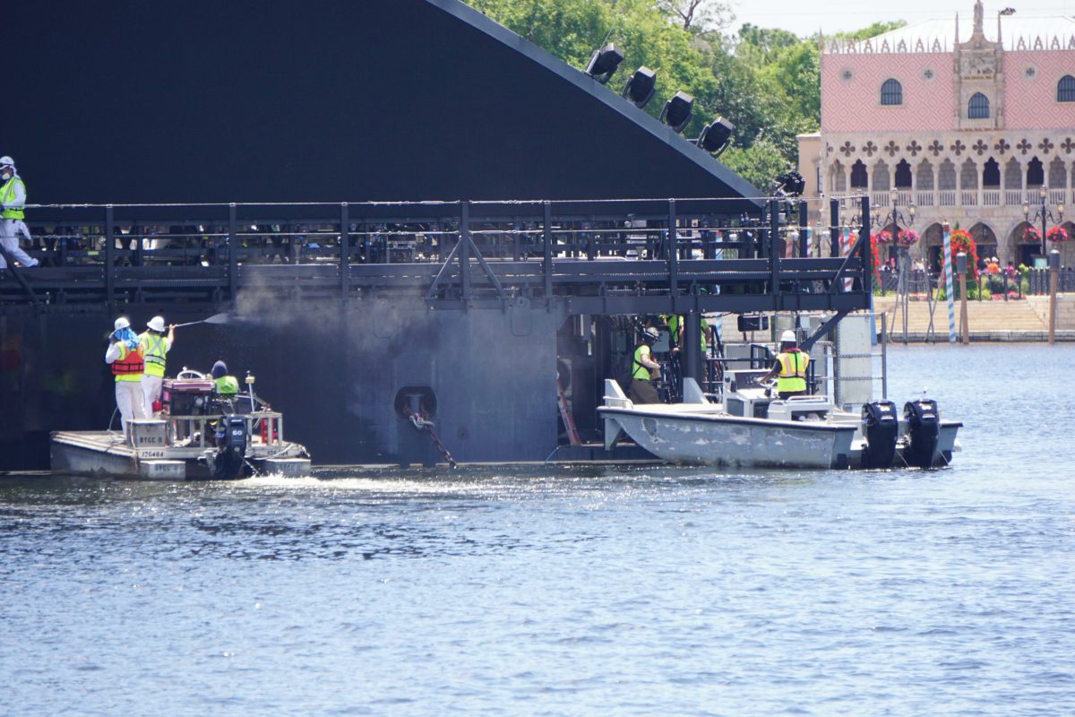 There were plenty of crew members on World Showcase Lagoon in EPCOT this morning as they cleaned and painted some of the “Harmonious” barges parked in the water.