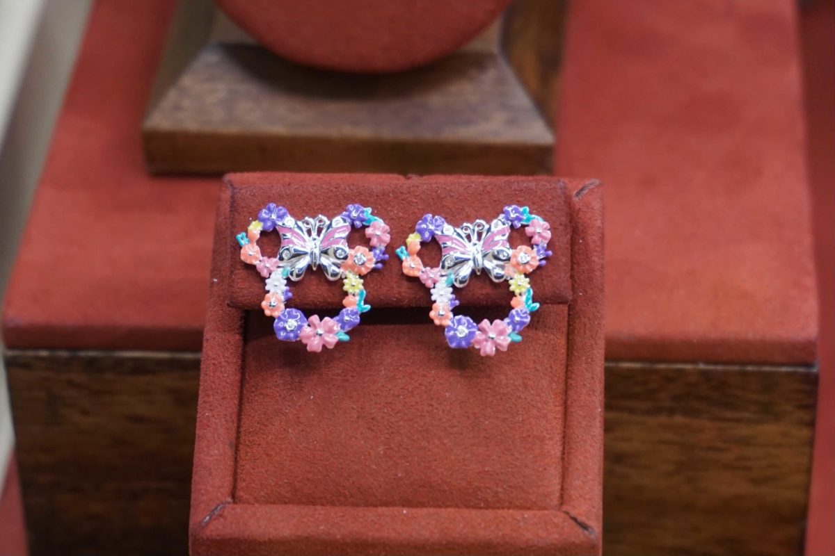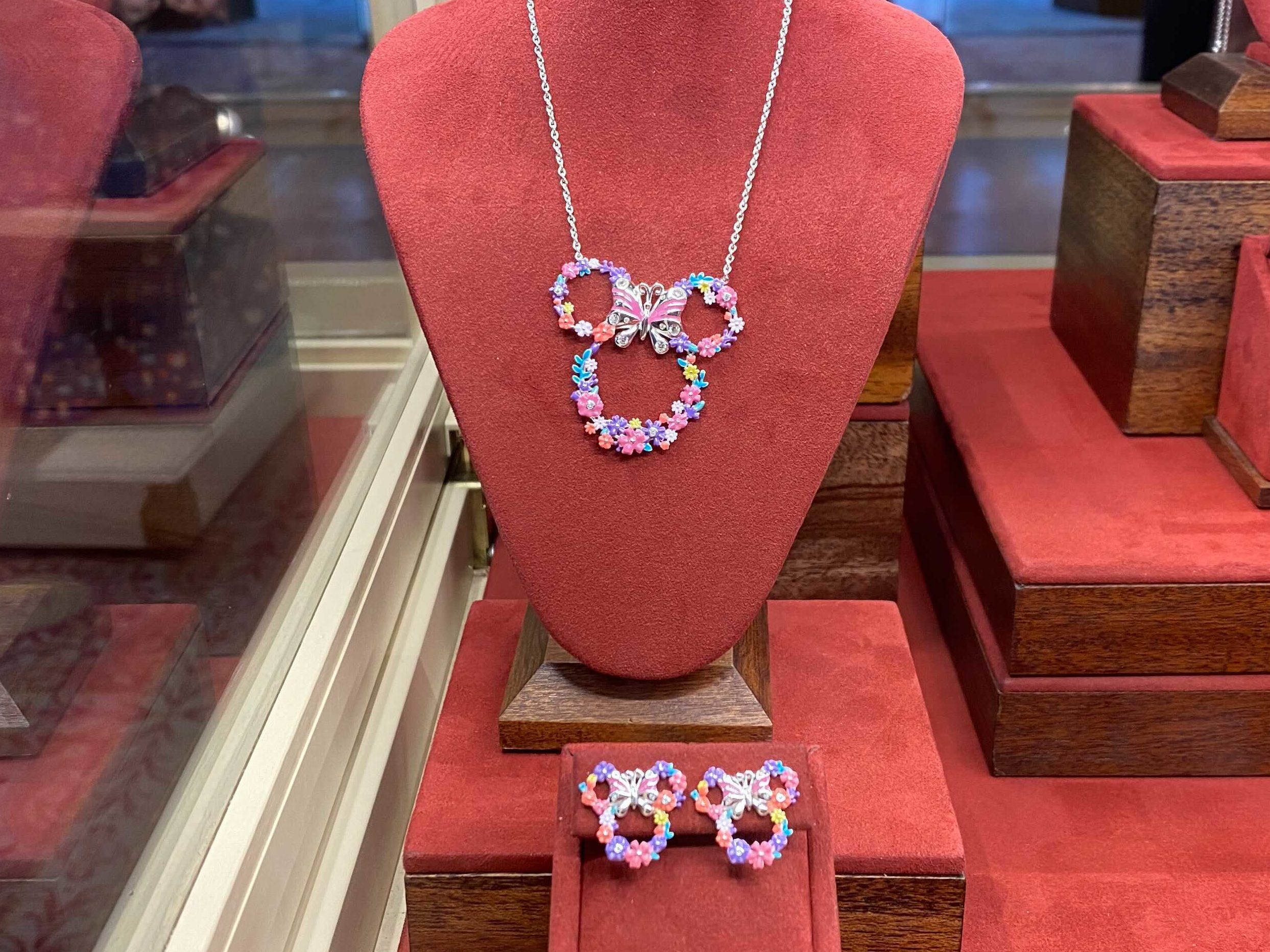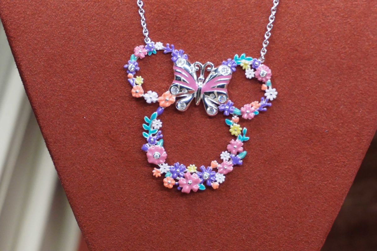 The new set has Minnie Mouse made out of flowers with a butterfly as her signature bow. The earrings and the necklace are the same design, featuring purple, yellow, orange, and pink flowers.