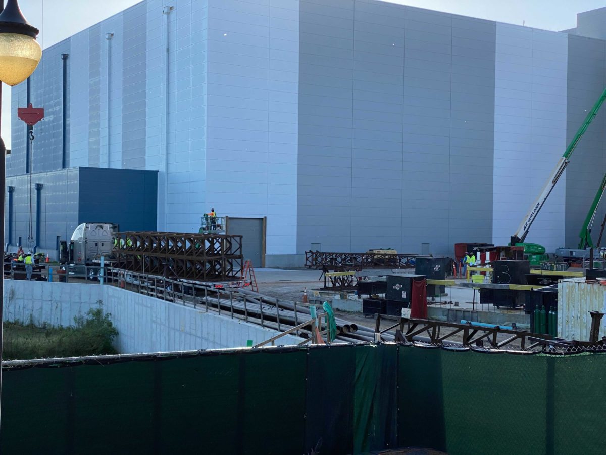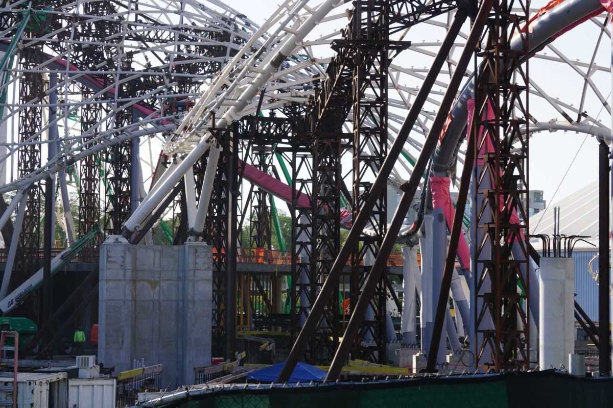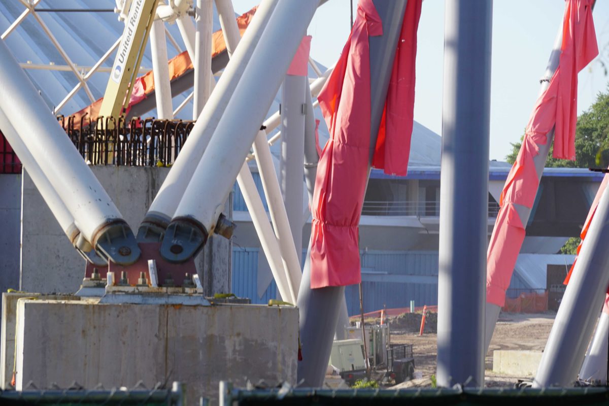 While indoor construction at TRON Lightcycle Run at the Magic Kingdom is still on hold, crews are hard at work on the canopy structure outside. Less than two weeks ago, we reported that the canopy frame was complete.