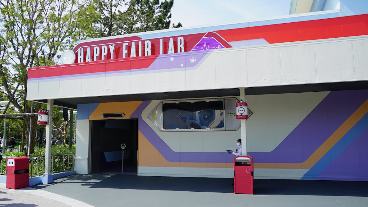 Situated inside the former Tomorrowland Hall lottery location, the Happy Fair Lab features red and purple paint on the upper layer, but retains the old purple/orange/blue colors of Tomorrowland Hall. Incidentally, this used to be the queue for the Skyway back in the ’80s and ’90s.